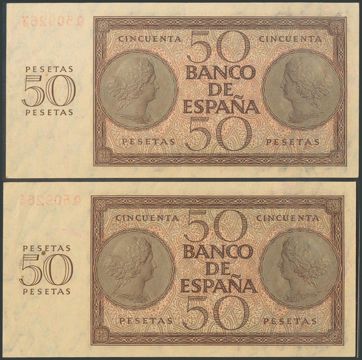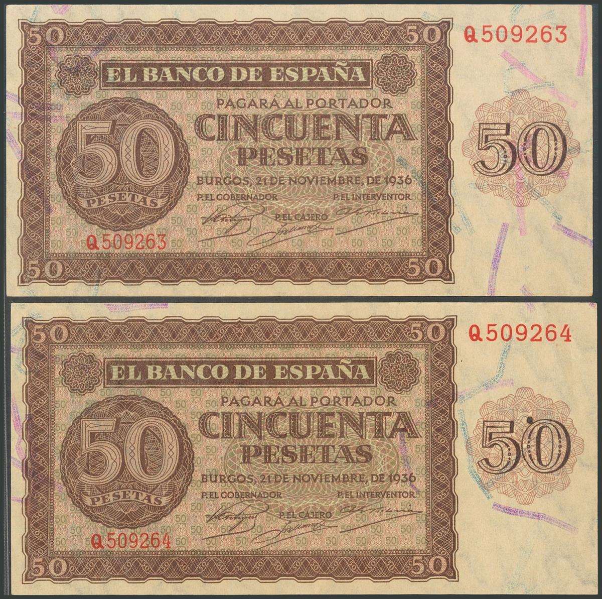 50 Pesetas. November 21, 1936. Correlative pair. Series Q. (Edifil 2017: 420a). It retains all its original size, minimal central waviness. Almost Uncirculated-.