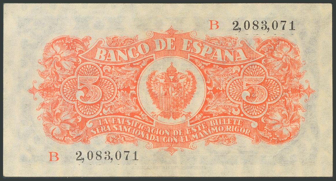 5 Pesetas. July 18, 1937. Series B. (Edifil 2017: 424a). Unusual Good Extremely Fine.