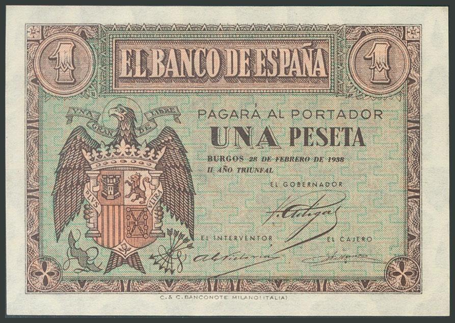 1 peseta. February 28, 1938. Series F. (Edifil 2017: 427a). Original sizing. Good Extremely Fine.