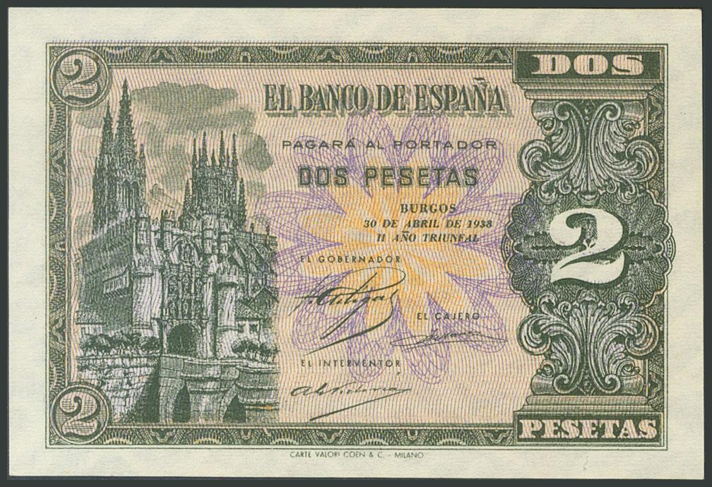 2 Pesetas. April 30, 1938. Series G. (Edifil 2017: 429a). Original sizing. Uncirculated.