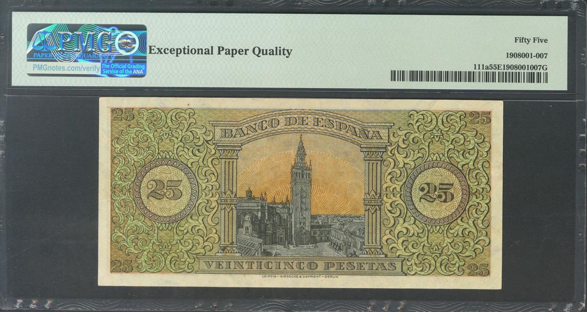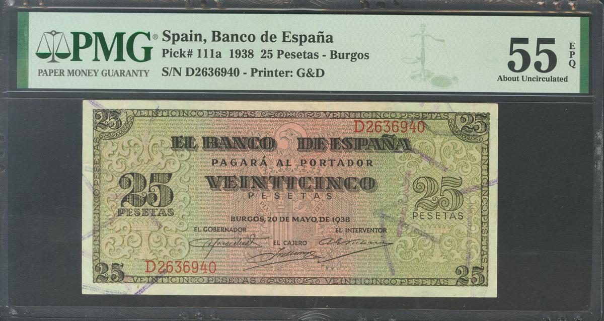 25 Pesetas. May 20, 1938. Series D. (Edifil 2017: 430a). Original sizing. Good Extremely Fine. Package PMG55EPQ.