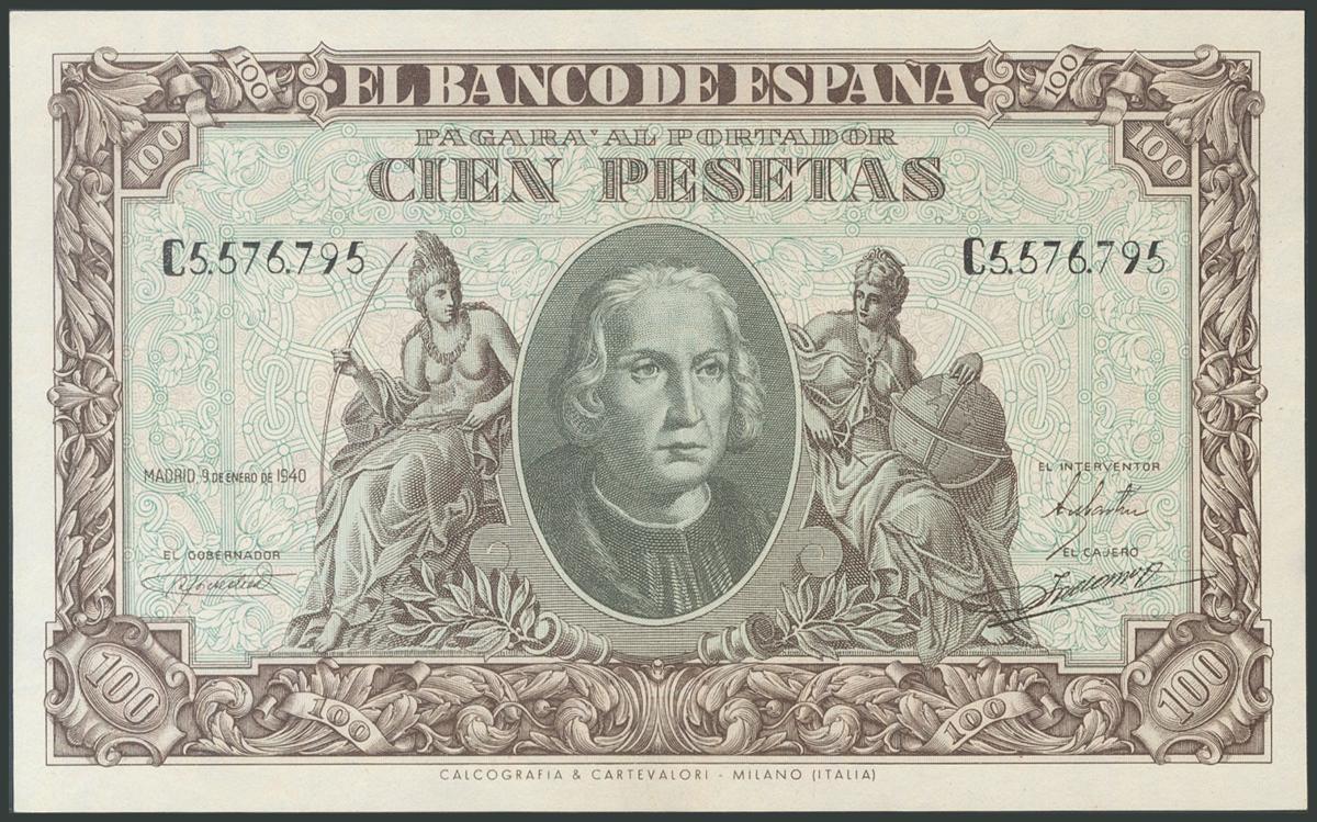 100 pesetas. January 1, 1940. Series C. (Edifil 2017: 438a). Original sizing. Uncirculated.