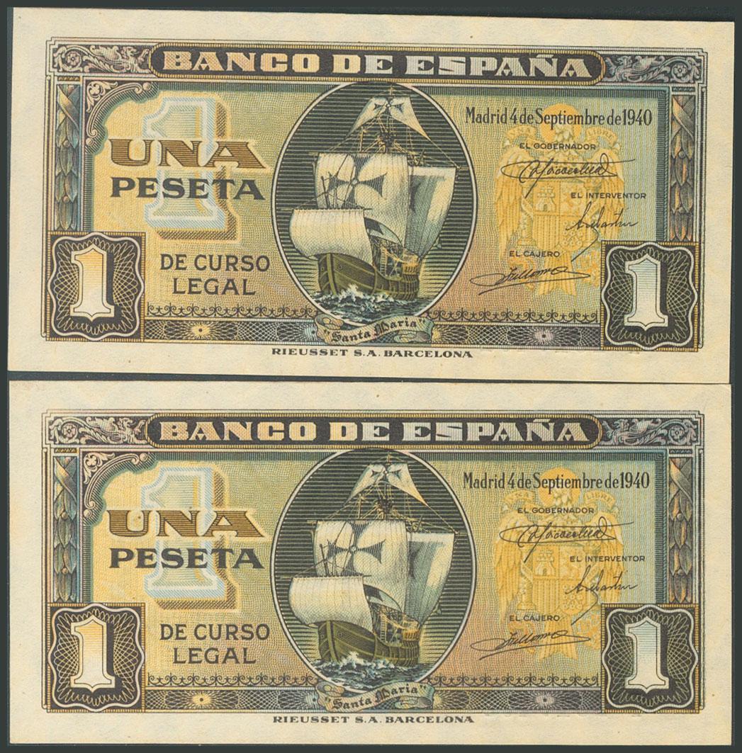 English 1 peseta. September 4, 1940. Correlative pair. Series I, last series issued. (Edifil 2017: 442a). It keeps all its original size. Uncirculated.