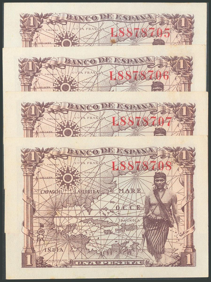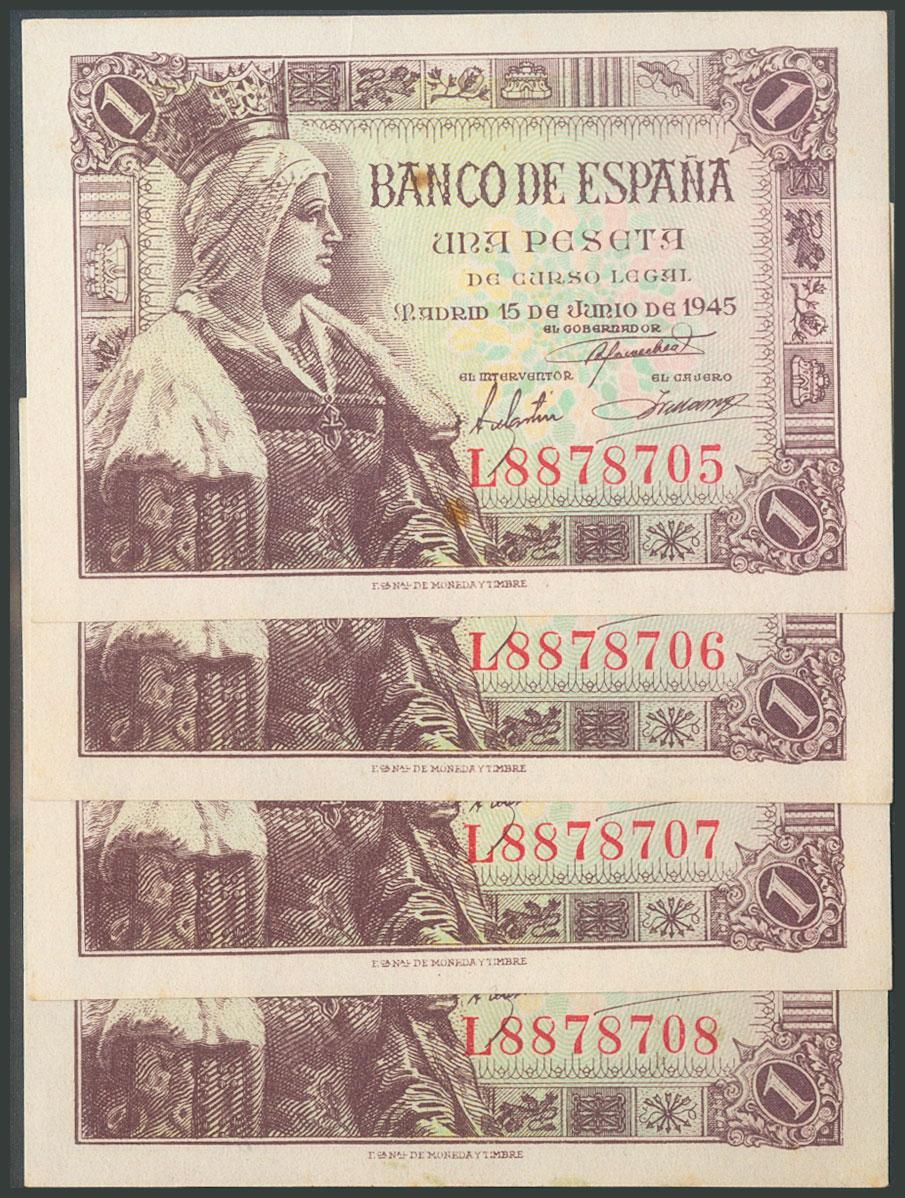 Four correlative banknotes of 1 Peseta issued on June 15, 1945 and with the series L. (Edifil 2017: 448a). Almost Uncirculated/ Good Extremely Fine.