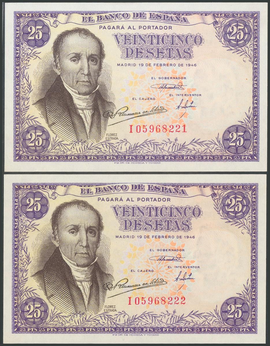 25 Pesetas. February 19, 1946. Correlative couple. Series I. (Edifil 2017: 450a). Original sizing. Uncirculated.