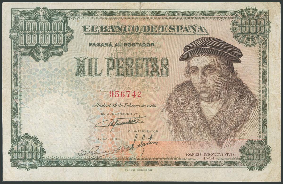 1000 Pesetas. February 19, 1946. Without series. (Edifil 2017: 453). Slight repair at the top of the center crease. Almost Very Fine.