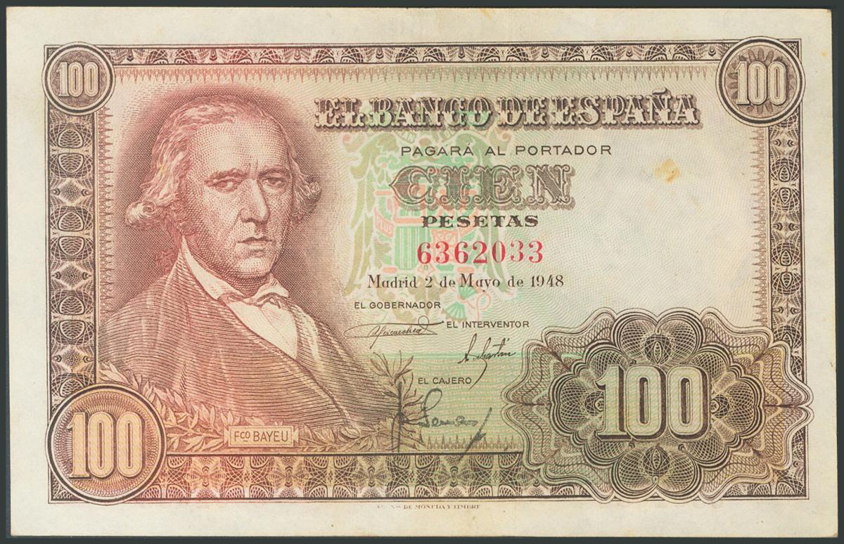 100 pesetas. May 2, 1948. Without series. (Edifil 2017: 456). It retains much of the original size. Good Extremely Fine.