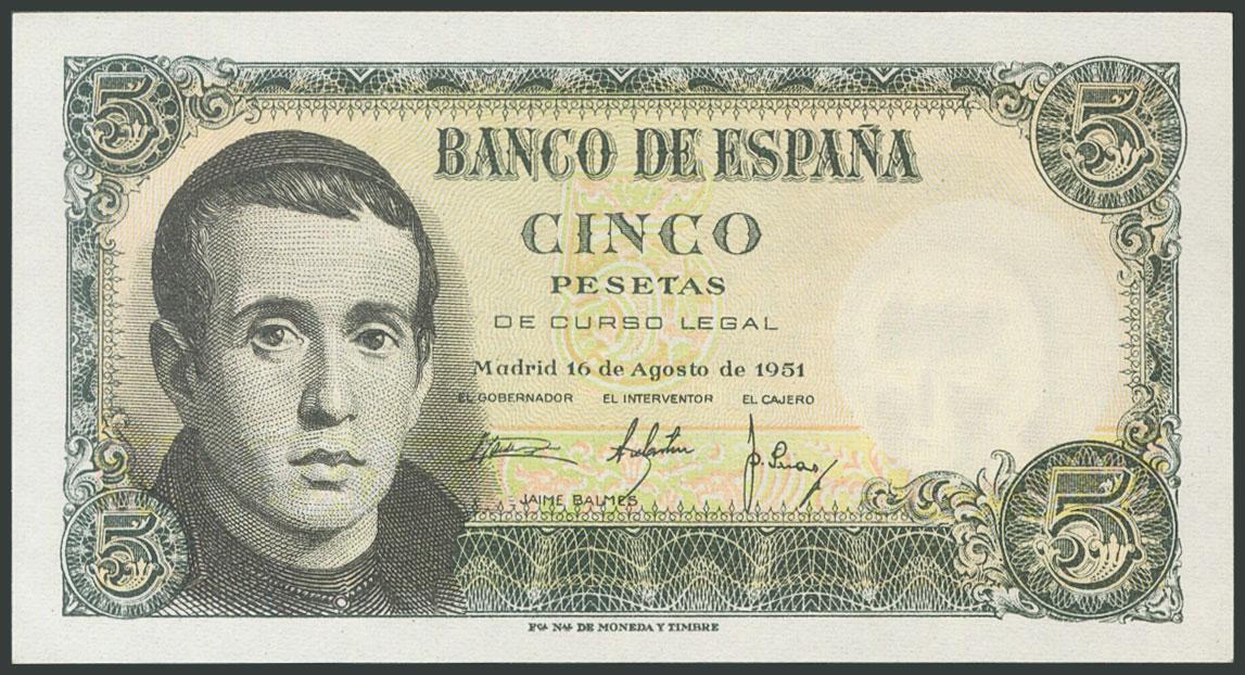 5 Pesetas. August 16, 1951. Series 1E. (Edifil 2017: 459a). Original sizing. Uncirculated.