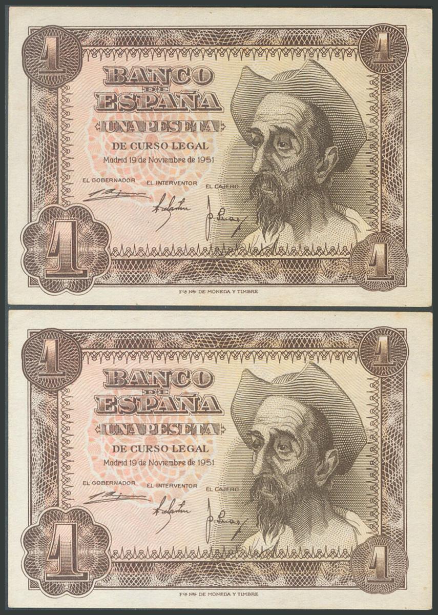 1 peseta. November 19, 1951. Correlative couple. No serie. (Edifil 2017: 461). Minimal rust spots. Good Extremely Fine.