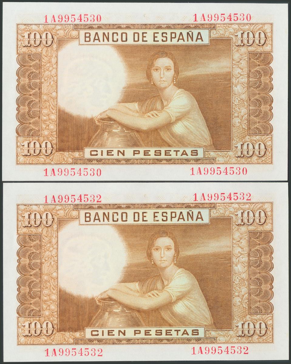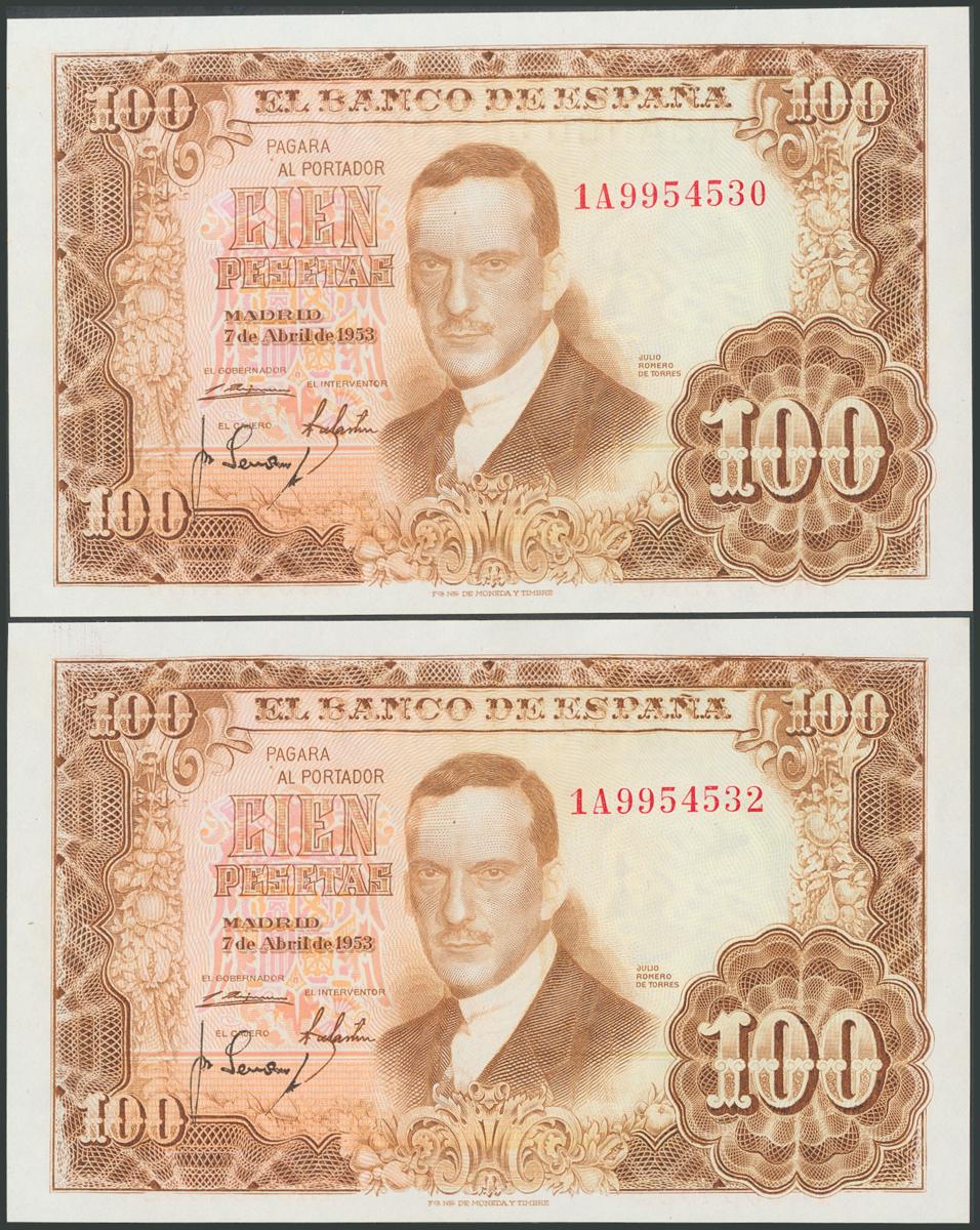 100 Pesetas issued. April 7, 1953. Almost correlative couple. Series 1A. (Edifil 2017: 464c). Uncirculated.