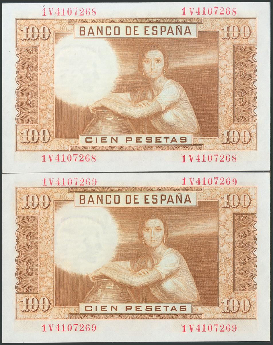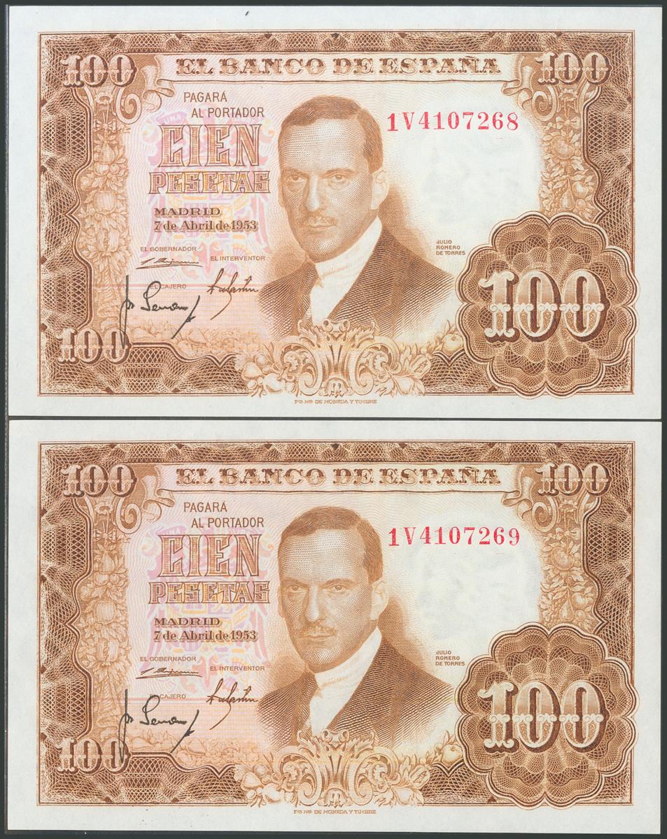 100 pesetas. April 7, 1953. Correlative couple. Series 1V. (Edifil 2017: 464c). Original sizing. Uncirculated.