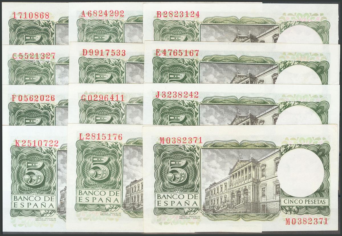 Beautiful set of 20 banknotes of 5 Pesetas issued on July 22, 1954, including all the letters (except H, I and W) and the one without series (A, B, C, D, E, F, G, J, K, L, M, N, P, Q, R, S, T, U and V). (Edifil 2017: 466, 466a). Rare set and of very good quality, all banknotes present original size. Uncirculated/ Almost Uncirculated.