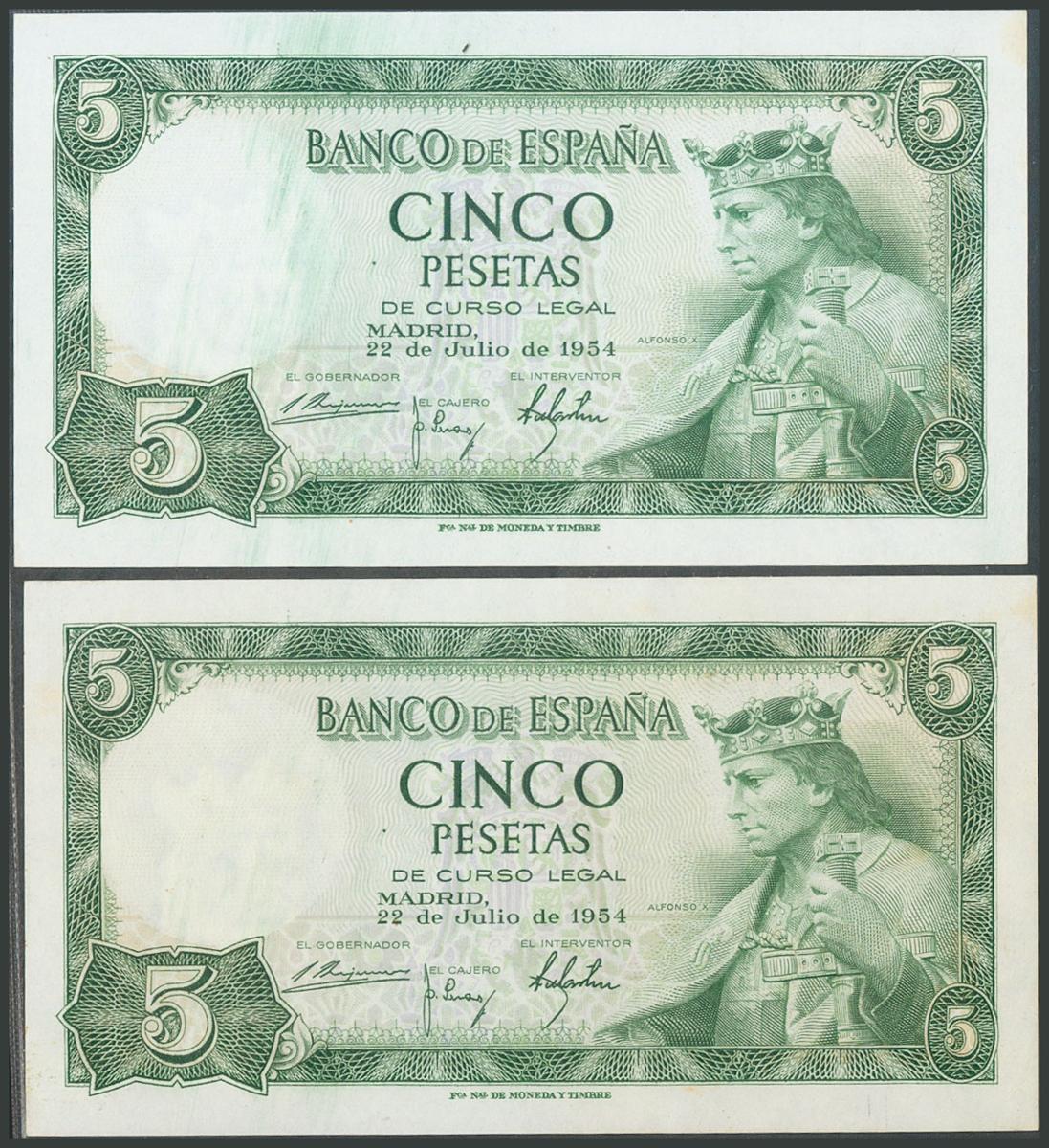 5 Pesetas. July 22, 1954. Correlative couple. Series U. (Edifil 2017: 466a). Original sizing. Almost Uncirculated.