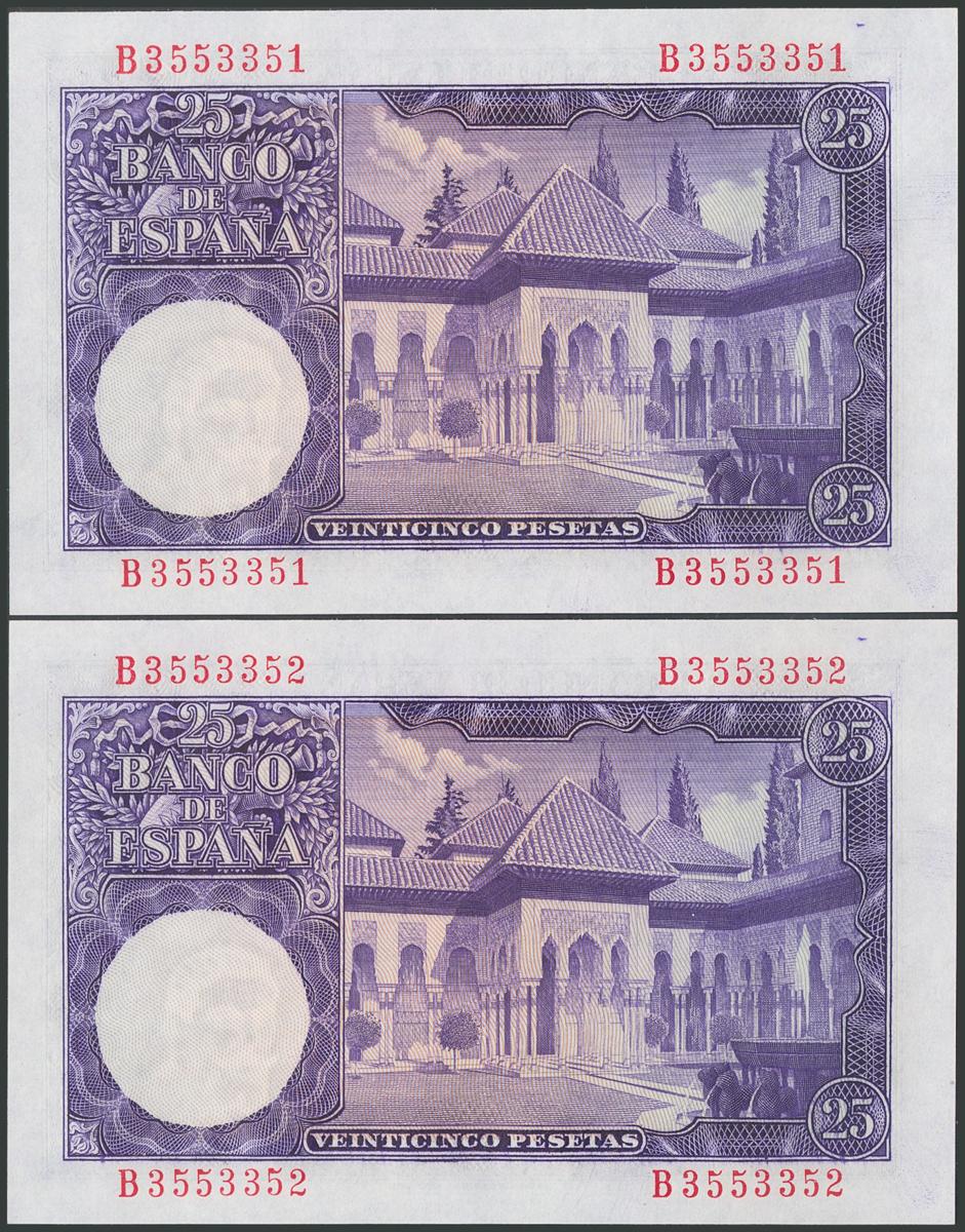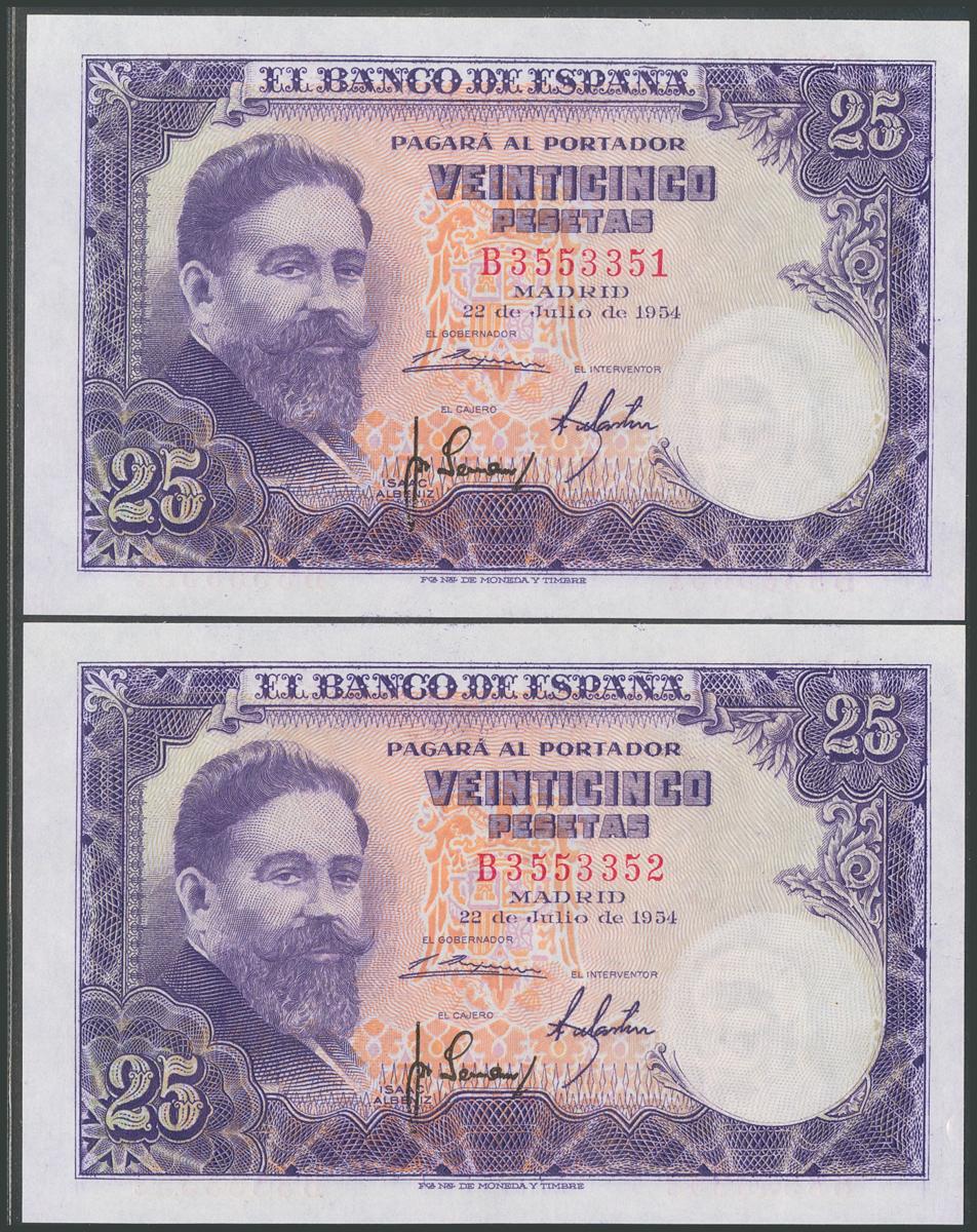 25 Pesetas. July 22, 1954. Correlative couple. Series B. (Edifil 2017: 467a). Uncirculated.