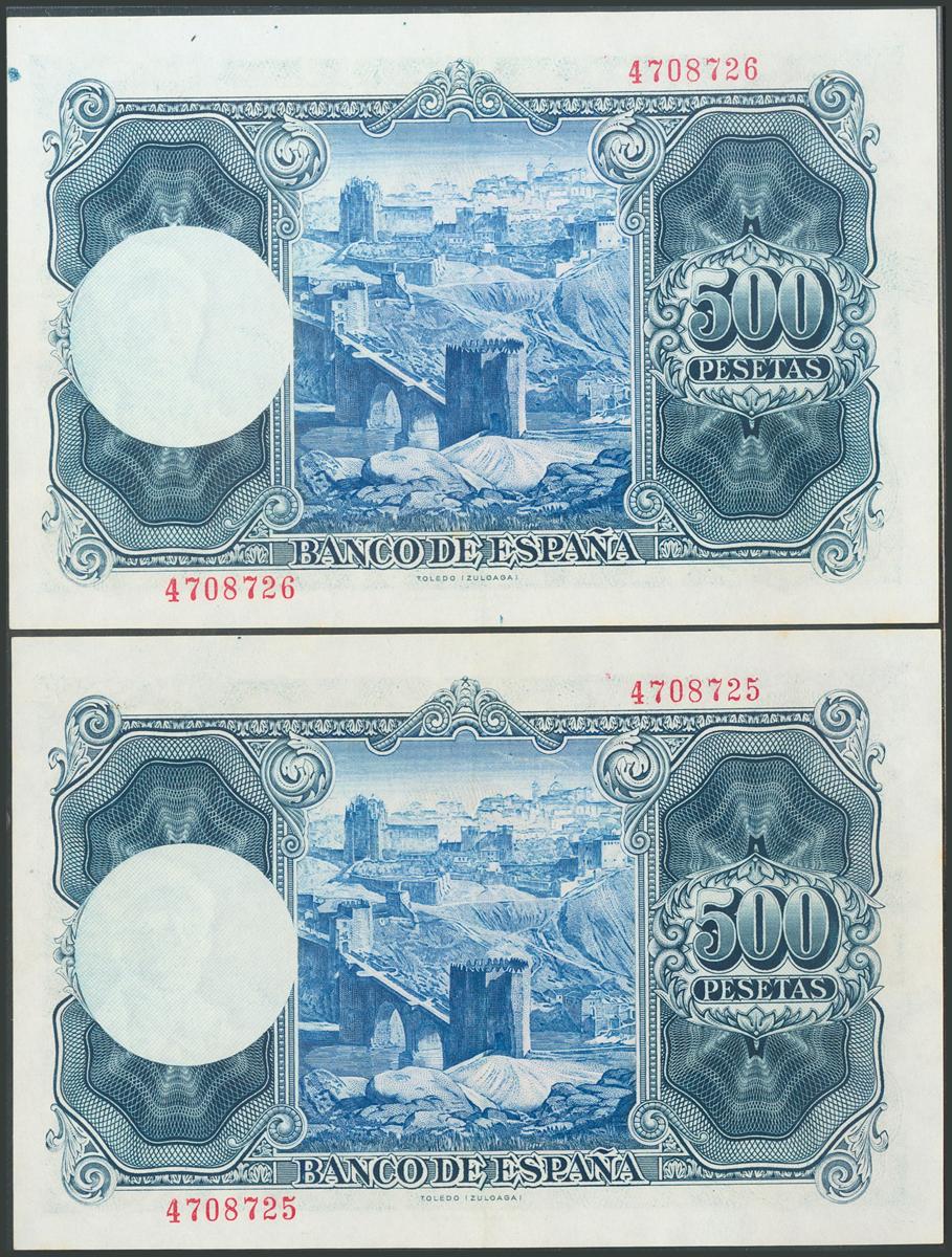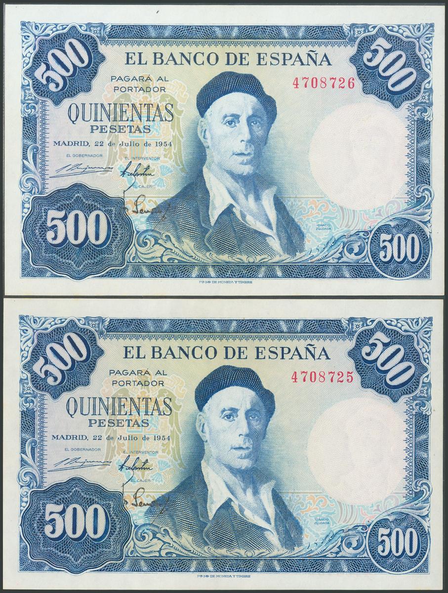 500 pesetas. July 22, 1954. Correlative couple. No serie. (Edifil 2017: 468). It keeps all its original size. Good Extremely Fine.