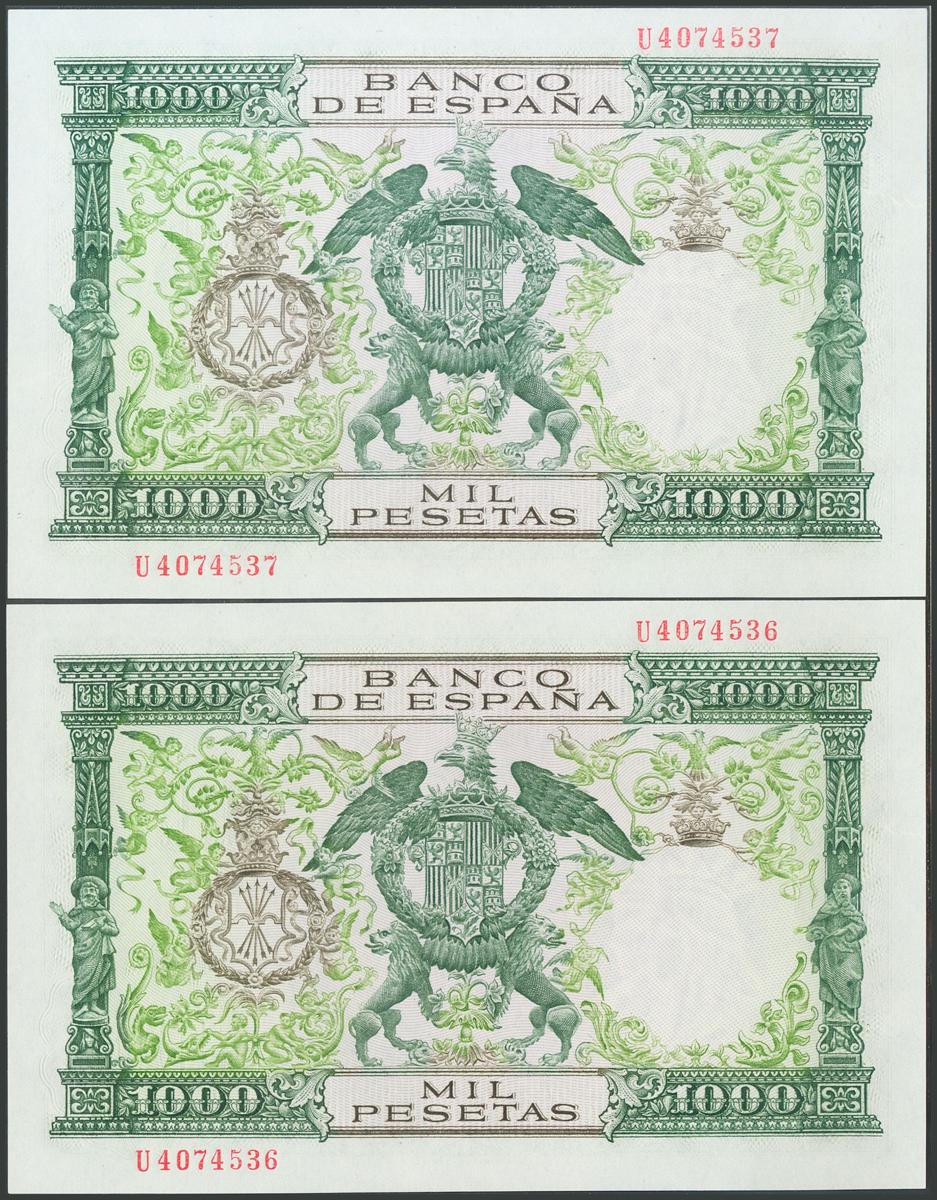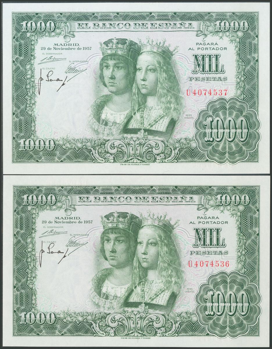 1000 Pesetas. November 29, 1957. Correlative pair. Series U. (Edifil 2017: 469b). Original sizing. Almost Uncirculated.