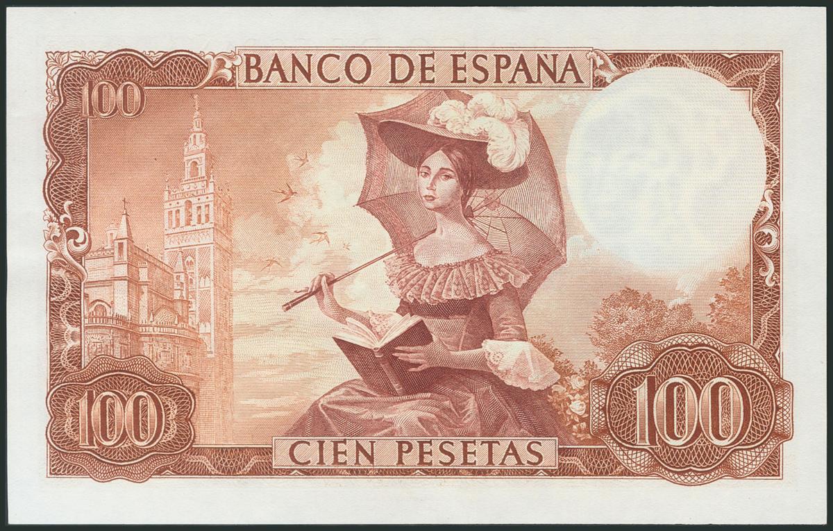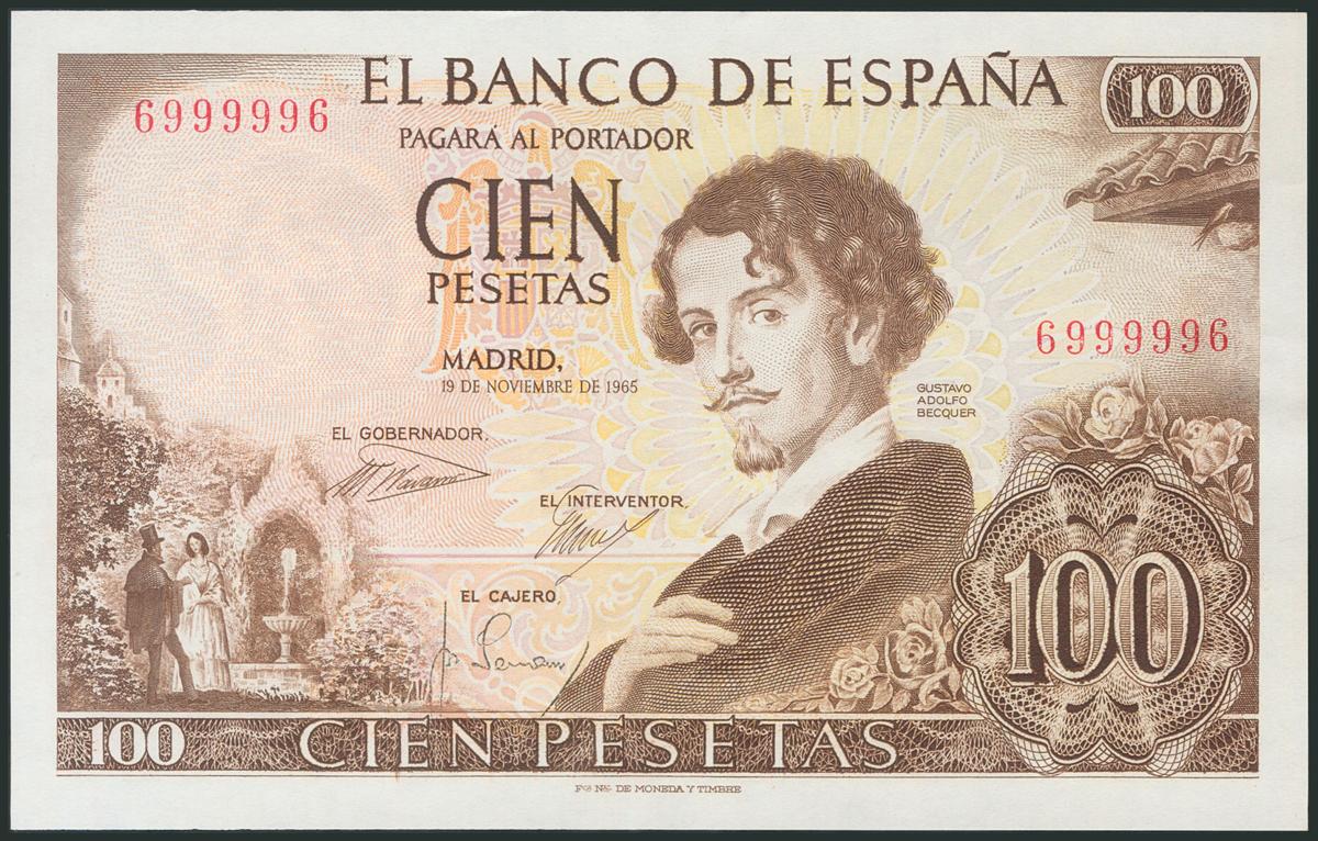 100 pesetas. November 19, 1965. Without series and capicúa numbering 6999996. (Edifil 2017: 470). Almost Uncirculated.