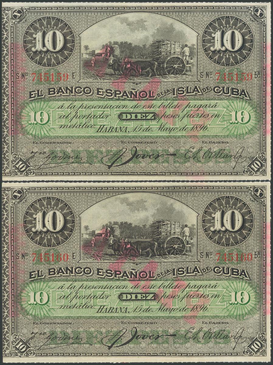 SPANISH BANK OF THE ISLAND OF CUBA. 10 pesos. May 15, 1896. Correlative pair. SILVER overload. (Edifil 2017: 82). Uncirculated.