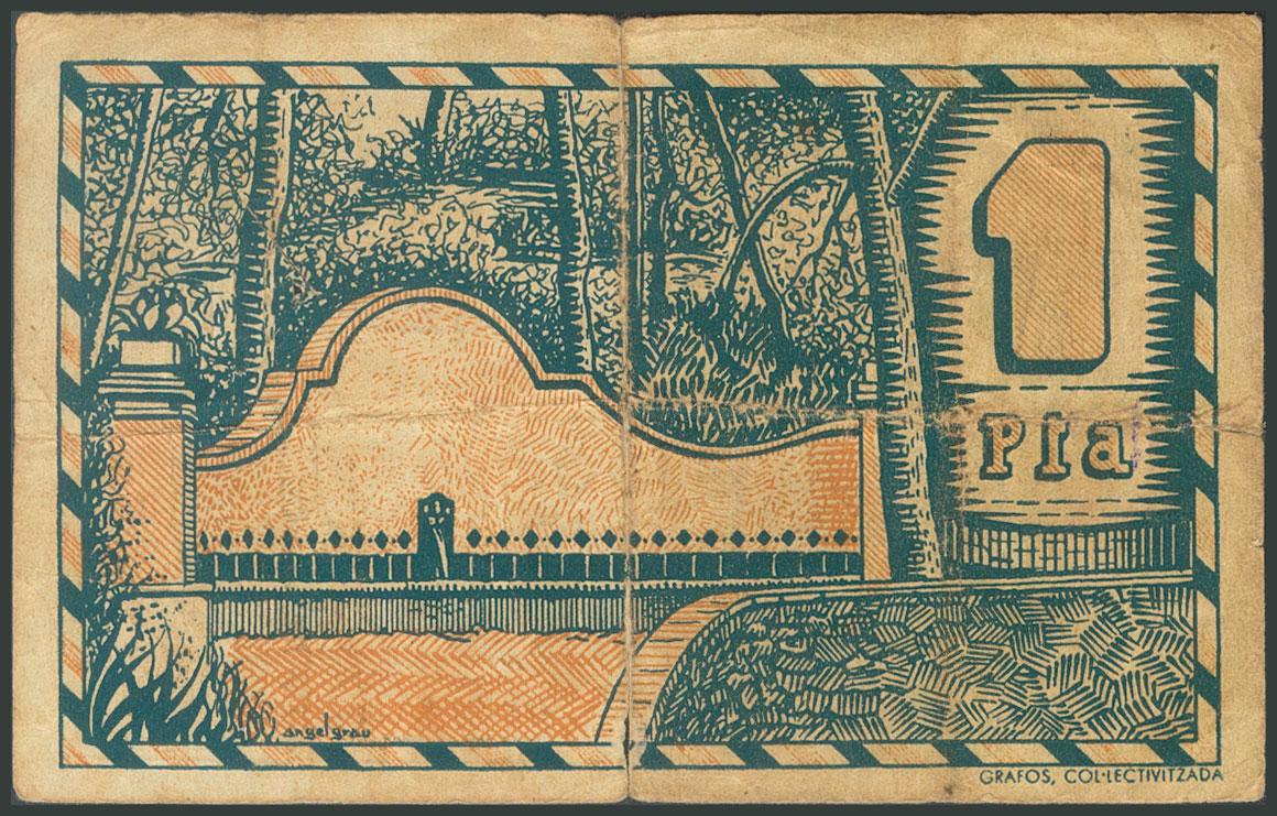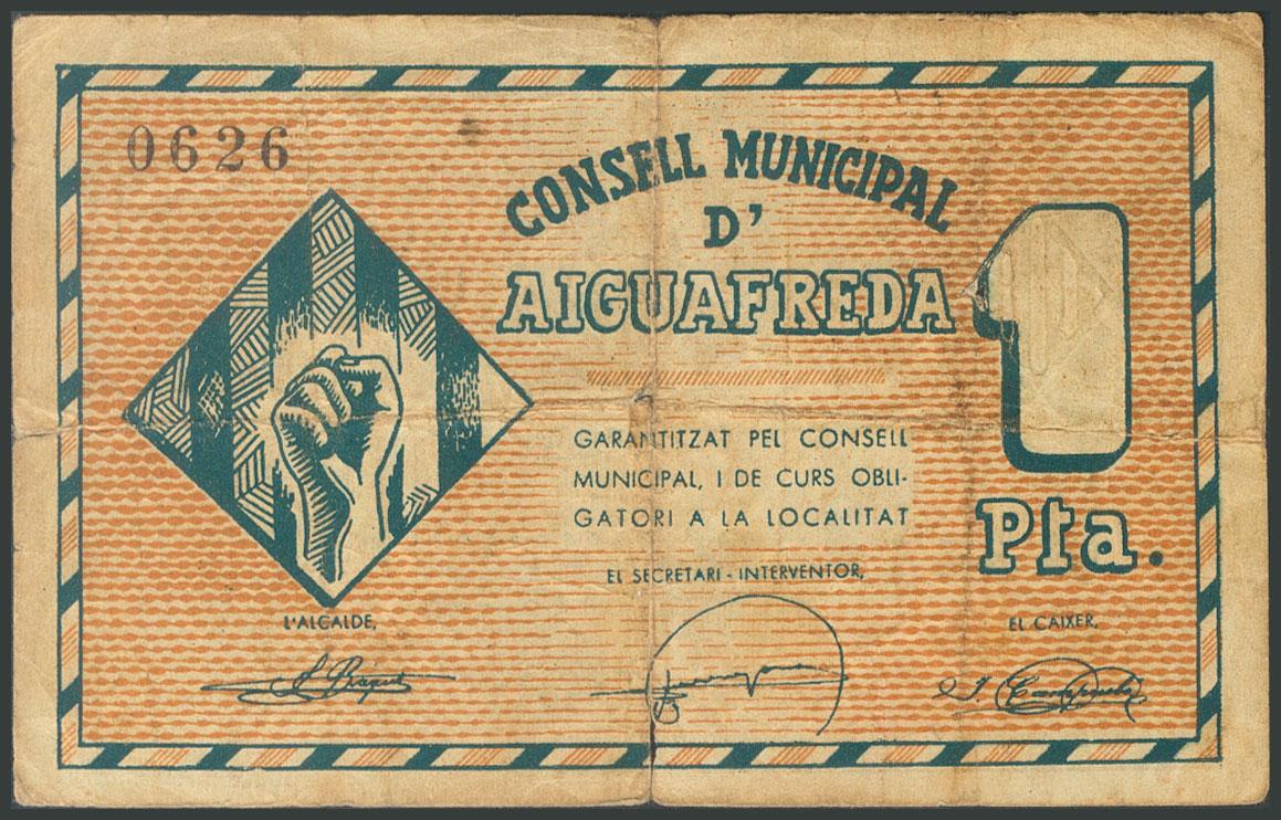 English AIGUAFREDA (BARCELONA). 1 peseta. (1938ca). Imperfect capicúa numbering. (González: 6039). Good.