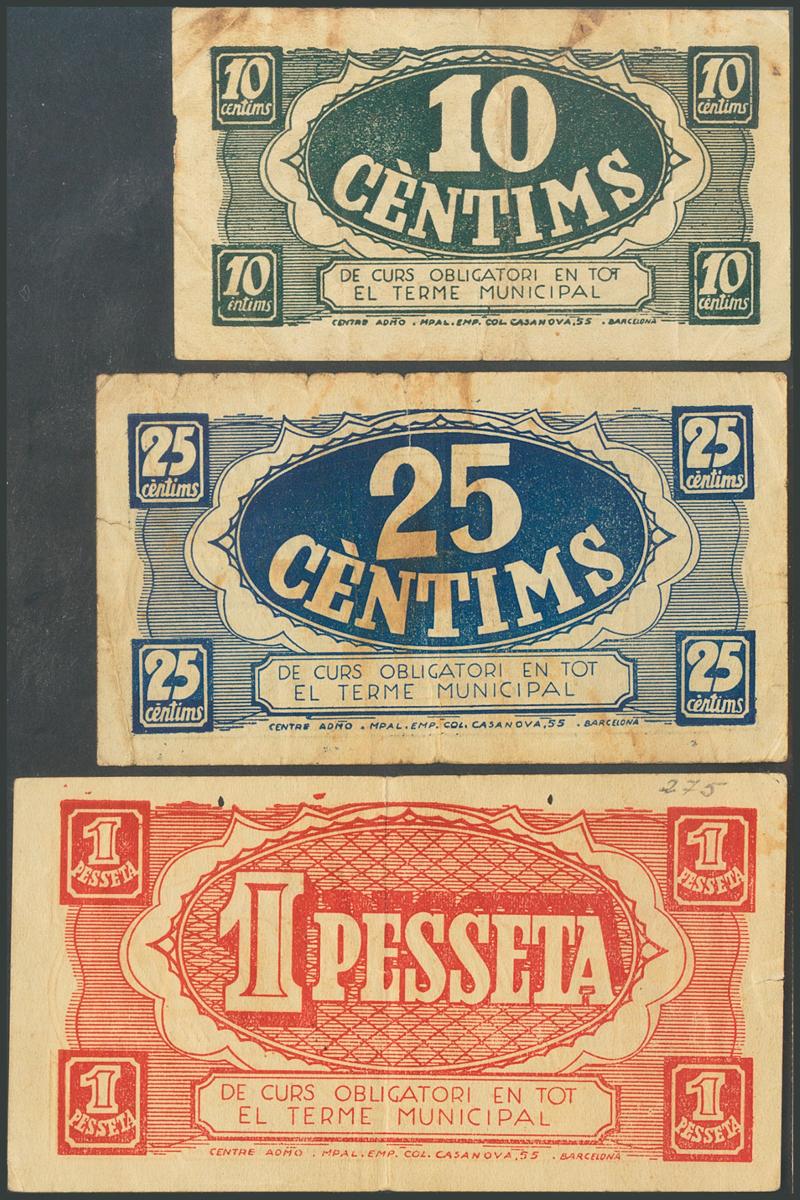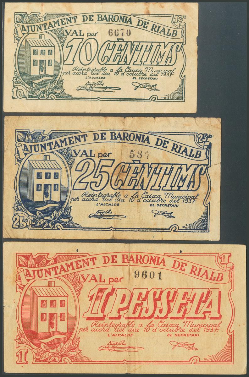 BARONIA DE RIALB (LERIDA). 10 Cents, 25 Cents and 1 Peseta. October 10, 1937. (González: 6902/04). Unusual complete series. Almost Very Fine.