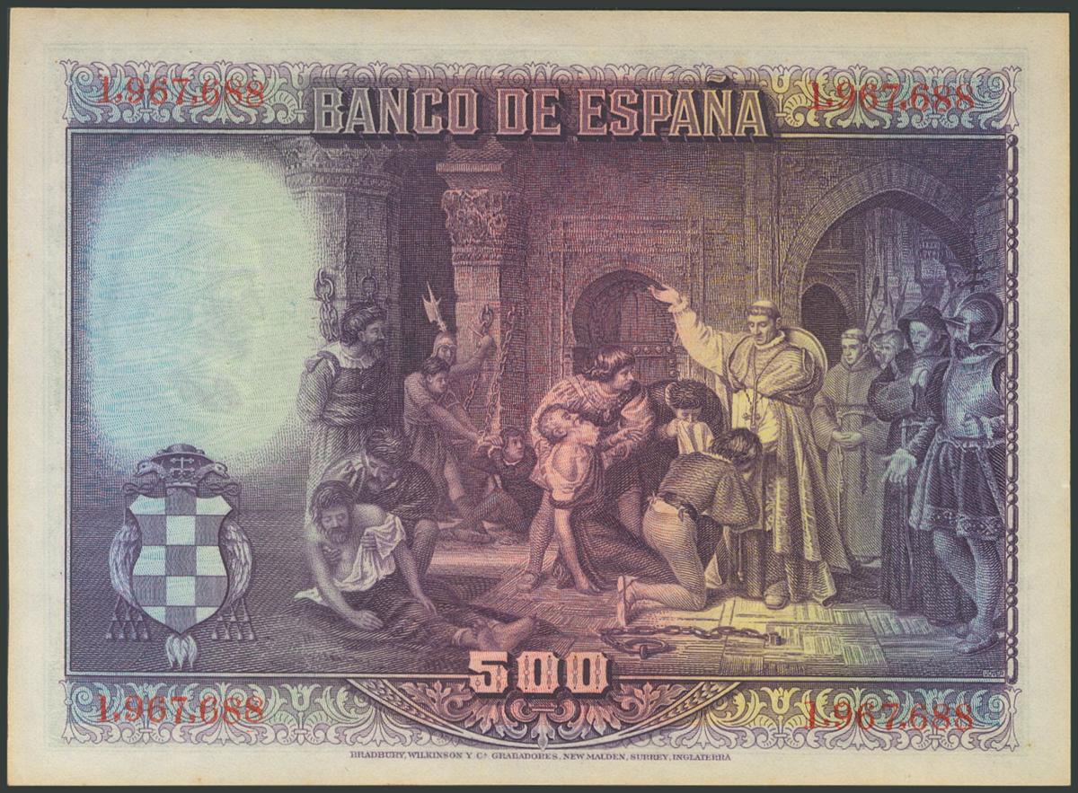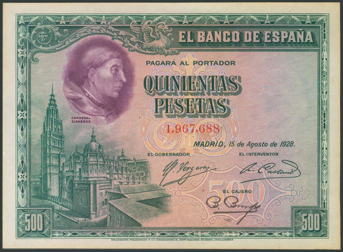 500 pesetas. August 15, 1928. Without series. (Edifil 2017: 356). It retains all its original finish, slightly tonalized. Good Extremely Fine.