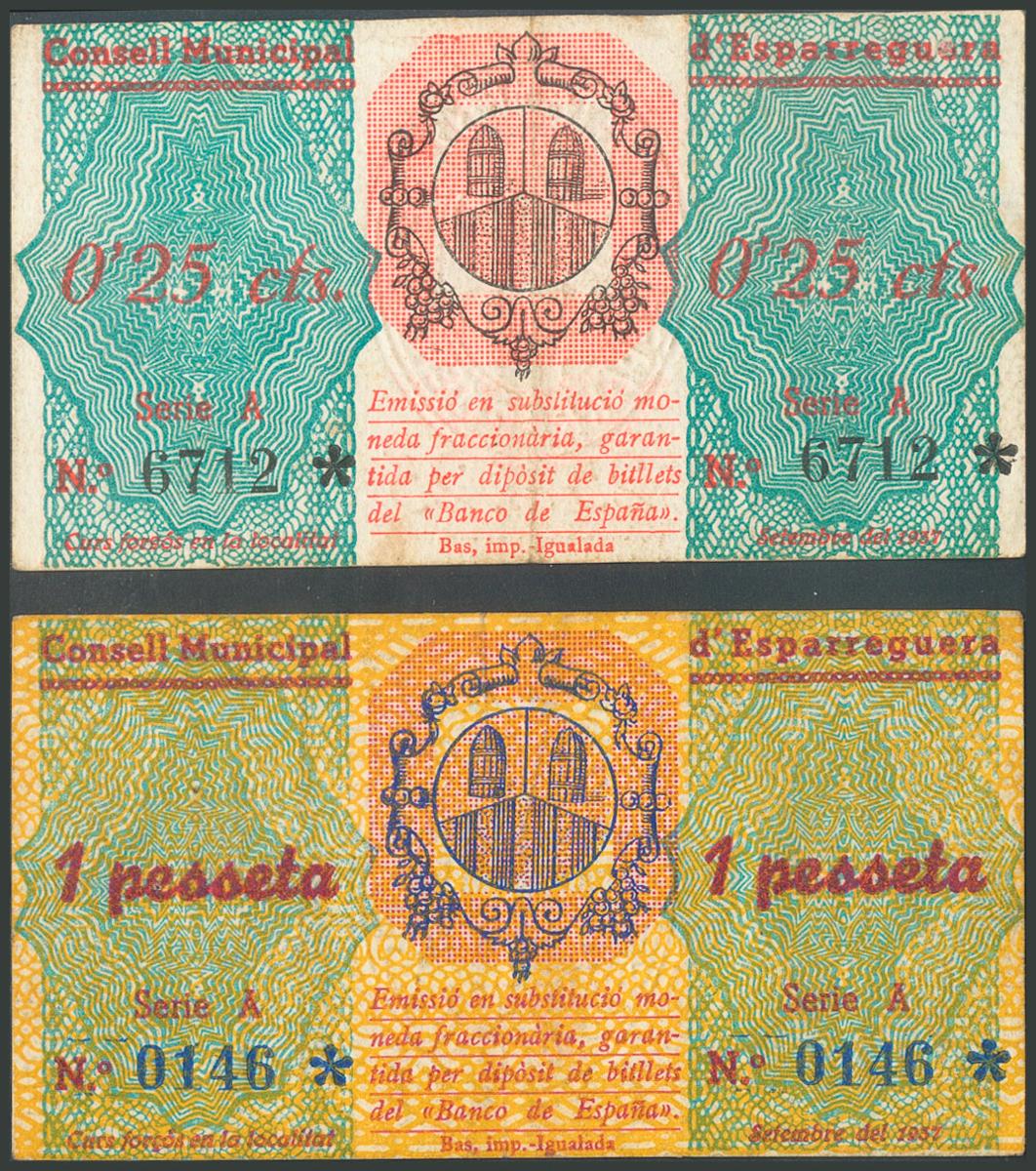 English ESPARREGUERA (BARCELONA). 25 Cents and 1 Peseta. September 1937. Series A, both. (González: 7748/49). Very Fine.