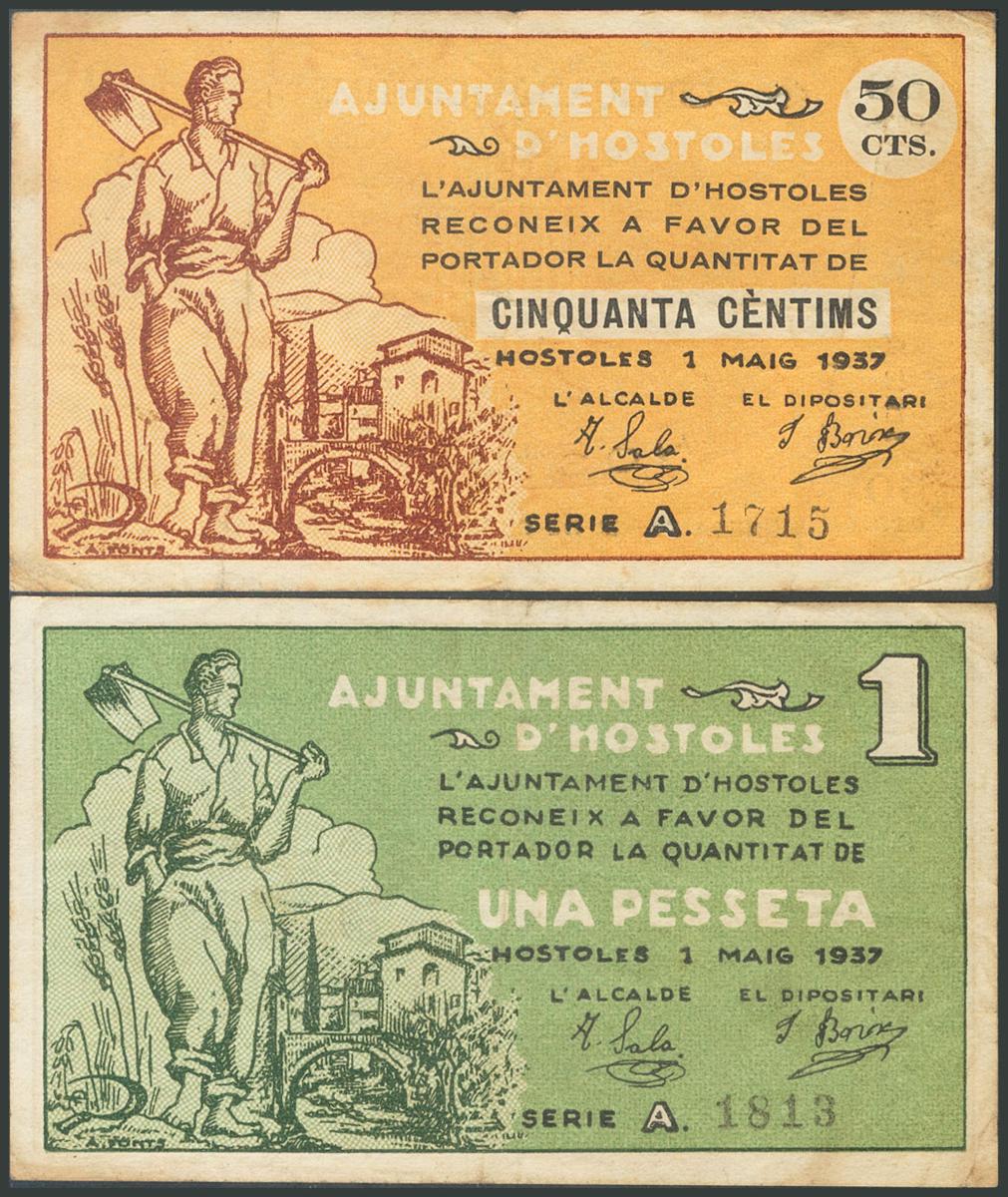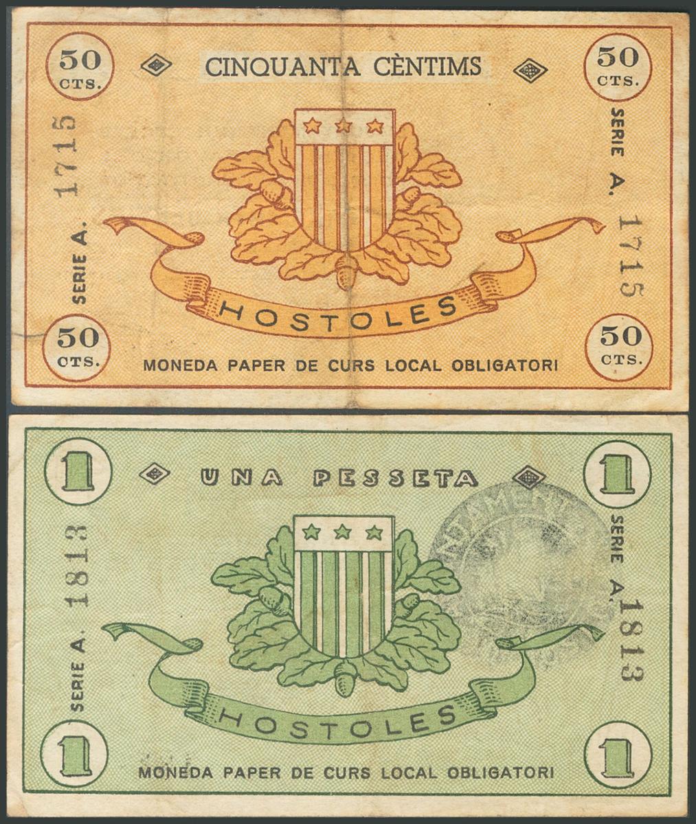 English HOSTOLES (GERONA). 50 Cents and 1 Peseta. (1937ca). Series A, both. (González: 8234/35). Unusual complete series. Good Very Fine.