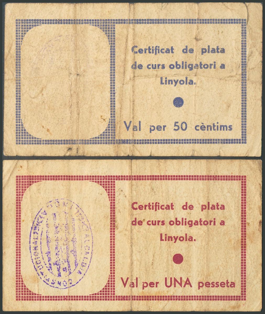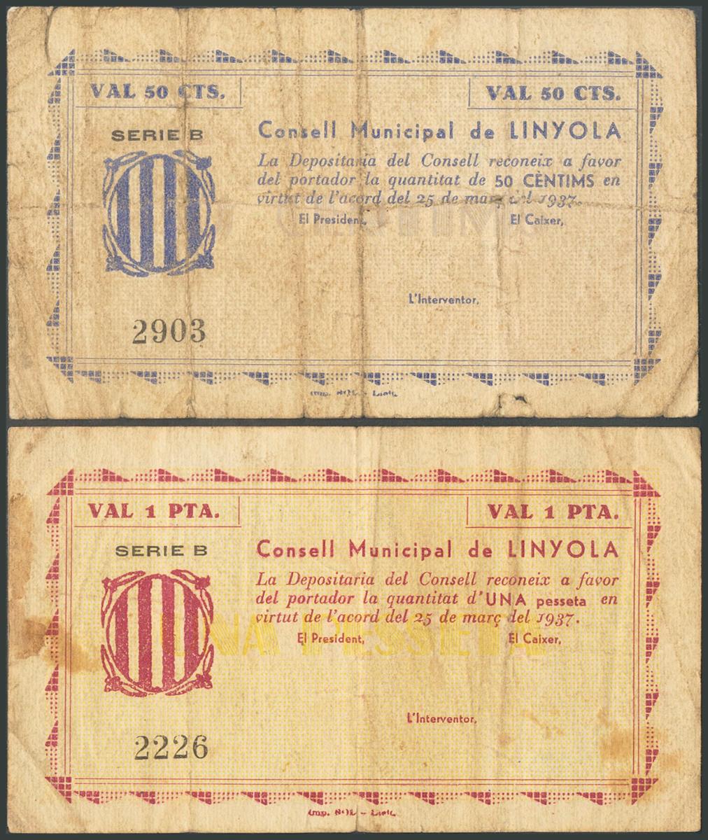 LINYOLA (LERIDA). 50 Cents and 1 Peseta. March 22, 1937. Series B, both. (González: 8314, 8316). Rare Almost Very Fine/ Good.