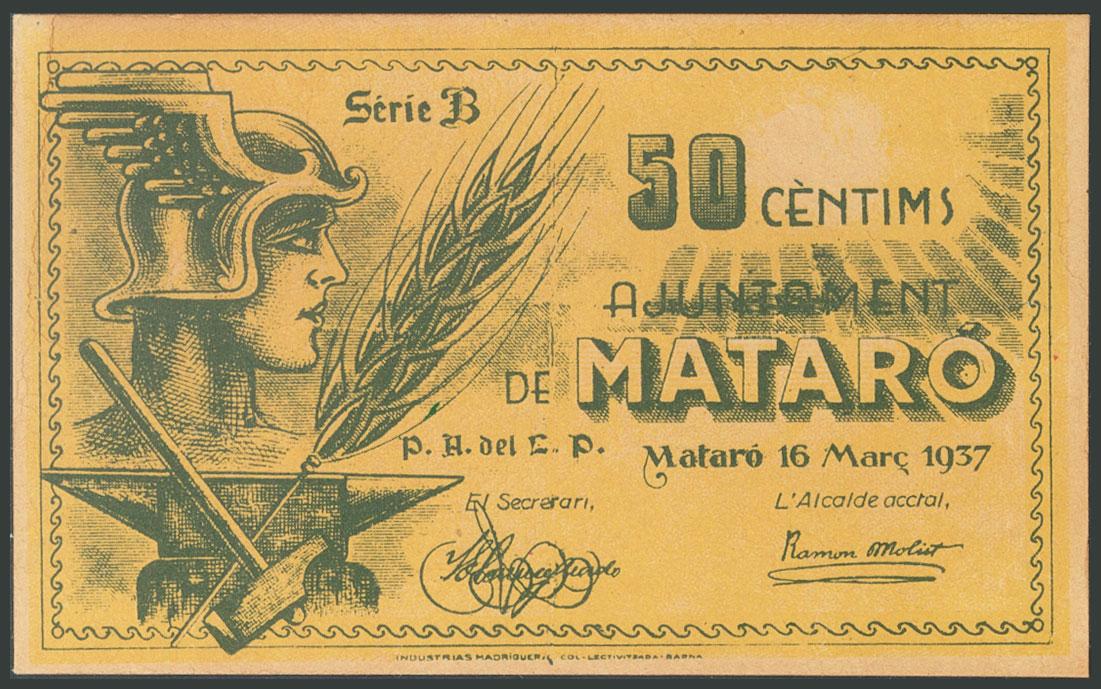 MATARO (BARCELONA). 50 cents. March 16, 1937. Series B. (González: 8658). Extremely Fine.