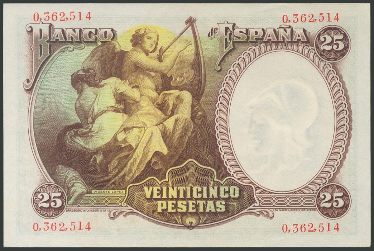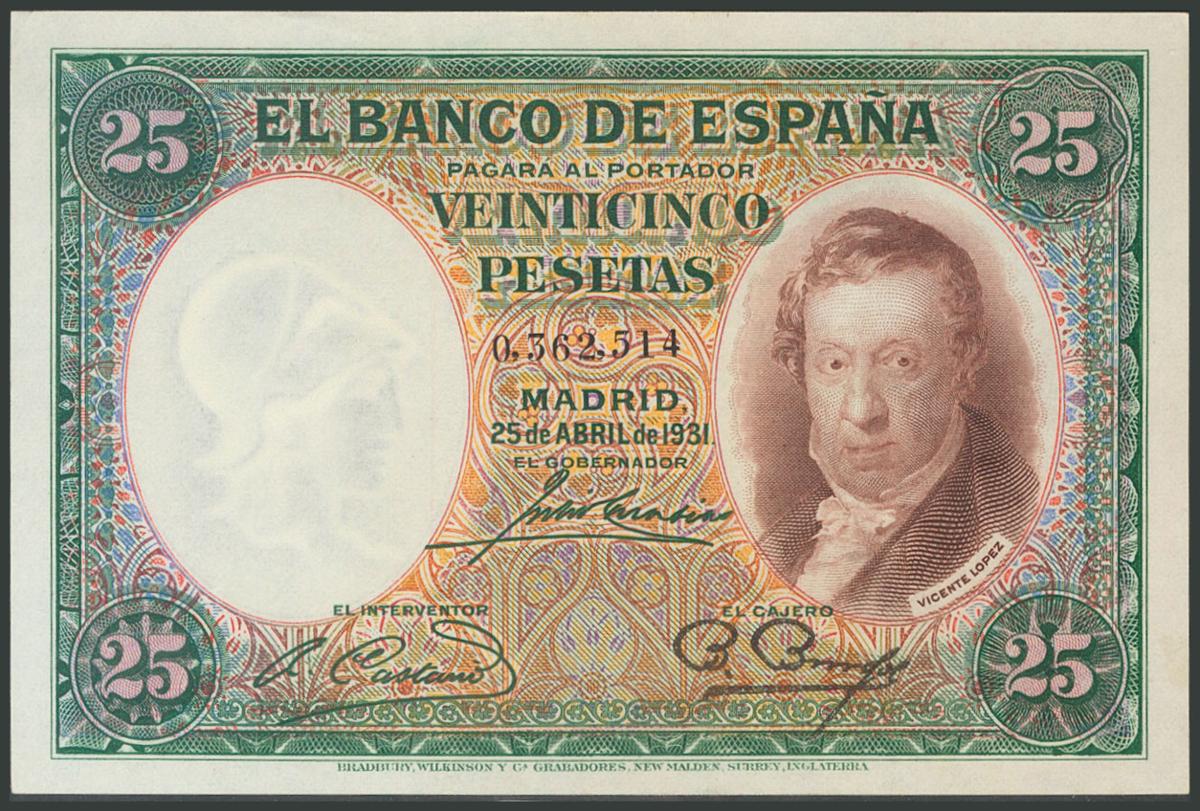 English 25 Pesetas. April 25, 1931. Without series. (Edifil 2017: 358). Original sizing. Almost Uncirculated.