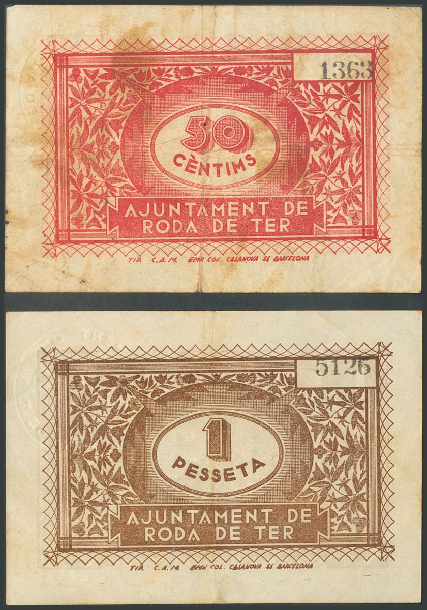 RODA DE TER (BARCELONA). 50 Cents and 1 Peseta. June 1937. (González: 9719/20). Unusual complete series. Very Fine/ Good Very Fine.