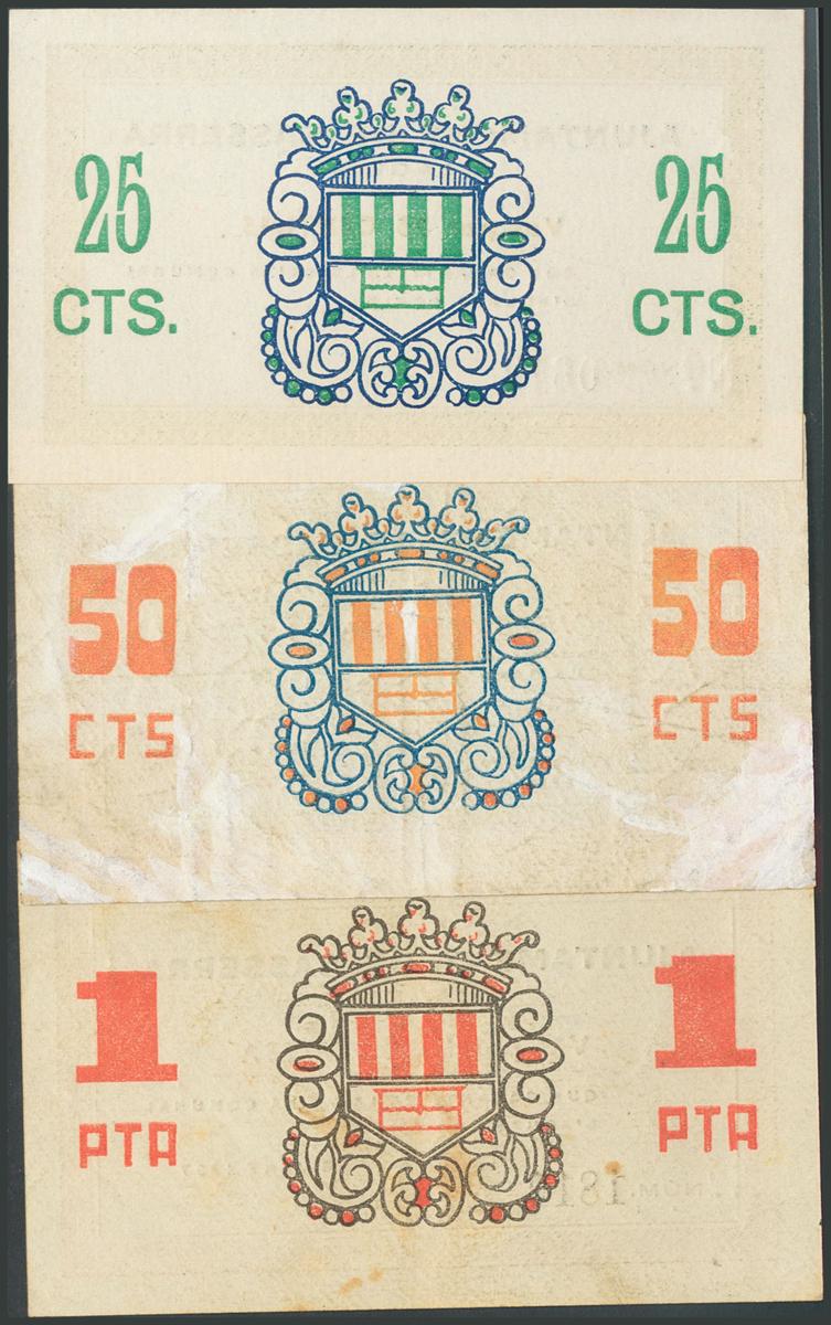 English SASSERRA (BARCELONA). 25 Cents, 50 Cents and 1 Peseta. June 18, 1937. (González: 9900/02). Rare complete series. Extremely Fine/ Good Fine.