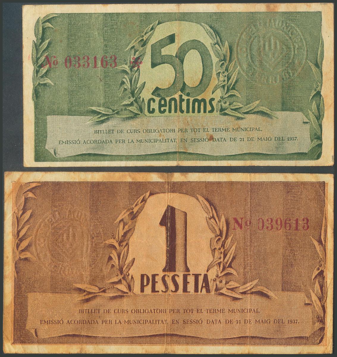English TERRASSA (BARCELONA). 50 Cents and 1 Peseta. May 21, 1937. (González: 10132/33). Fine/ Very Fine.