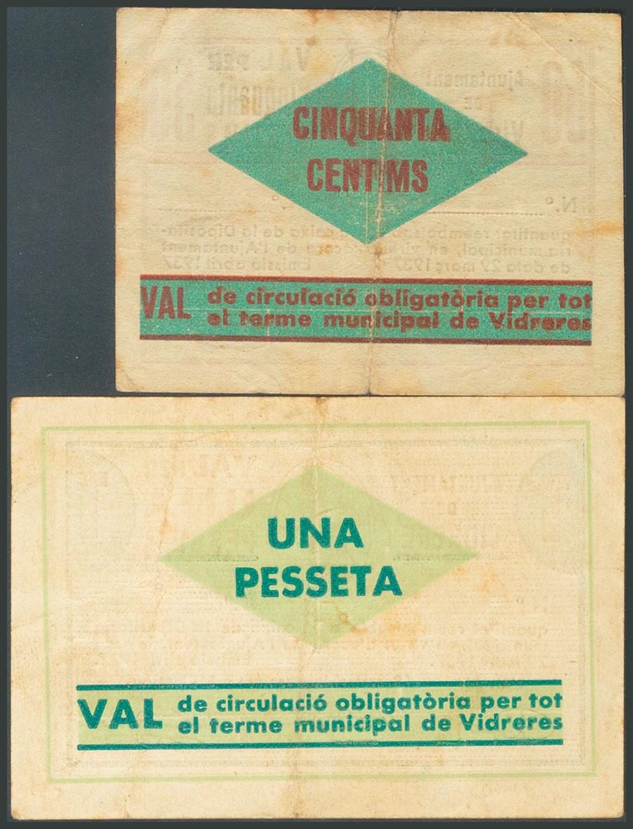 English VIDRERES (GERONA). 50 Cents and 1 Peseta. April 1937. Series B on 50 cts. (González: 10646/47). Rare complete series. Very Fine.