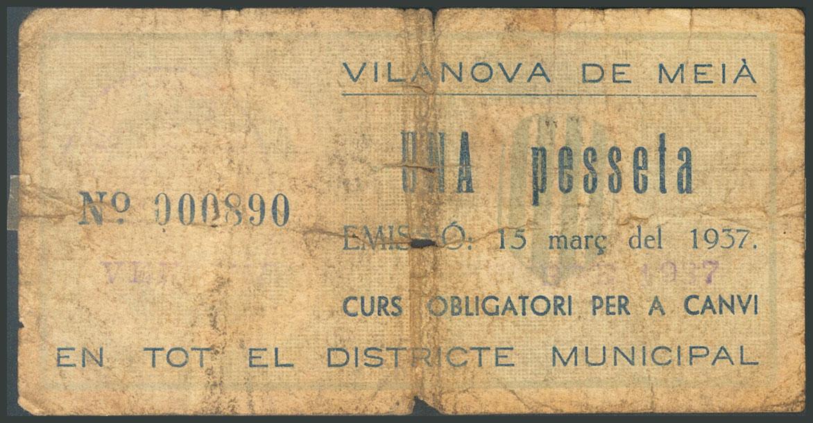VILANOVA DE MEIA (LERIDA). 1 peseta. March 15, 1937. (González: 10814). Very rare. Good.