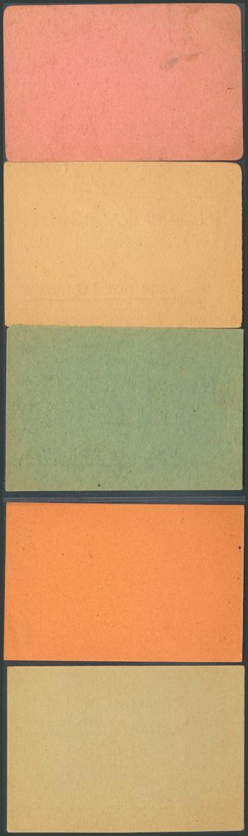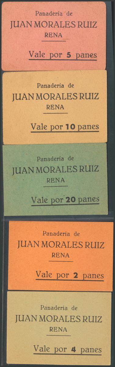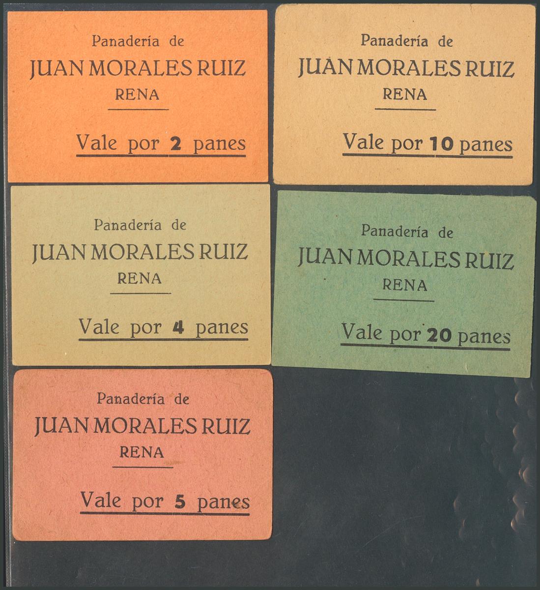 Set of 5 vouchers from Juan Morales Ruiz's bakery for 2 breads, 4 breads, 5 breads, 10 breads and 20 breads, from Rena, from Badajoz. Extremely Fine.