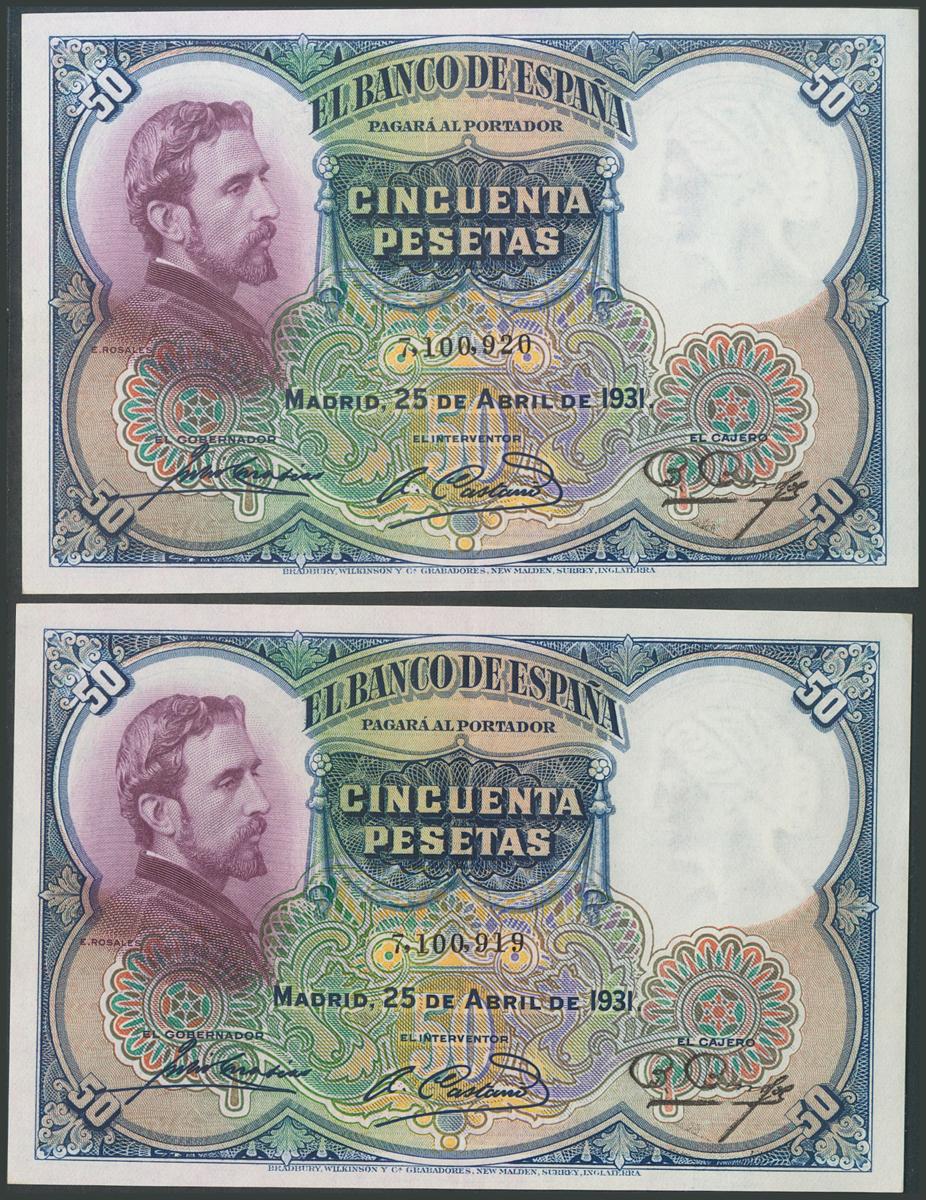 English 50 Pesetas. April 25, 1931. Correlative couple. (Edifil 2017: 359). Unusual, it retains all its original finish. Good Extremely Fine.