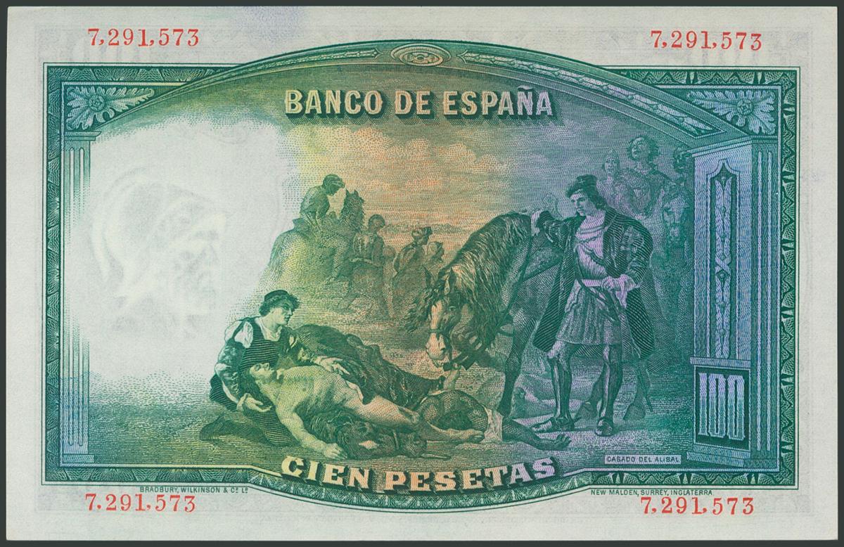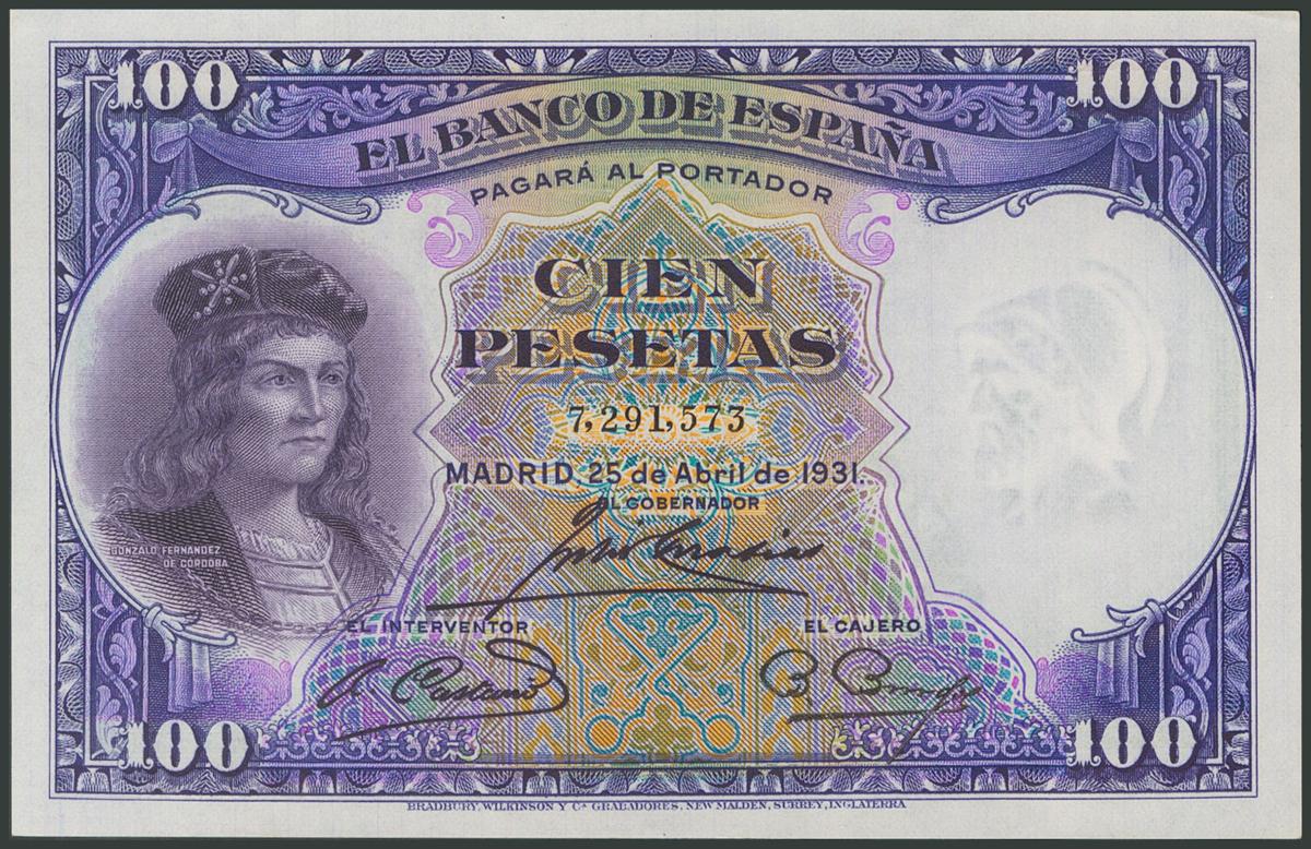100 pesetas. April 25, 1931. Without series. (Edifil 2017: 360). Original sizing. Uncirculated.