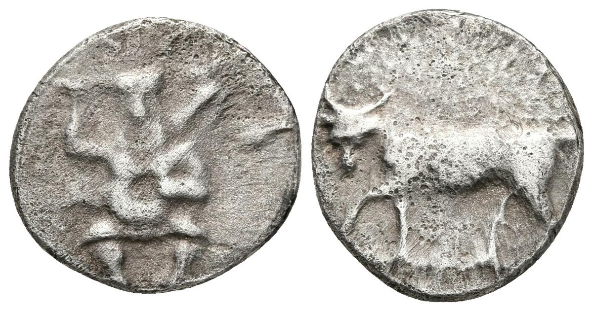 EBUSUS. Hemidracma. Ibiza. 200-100 a.C. A/ Bes sosteniendo martillo y serpiente. R/ Toro andando a izquierda. FAB-915. Ar. 2,37g. MBC-. Escasa.