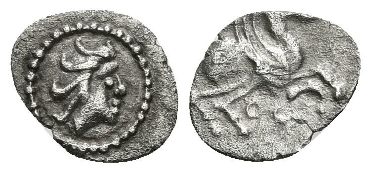 EMPORITON. Hemitritartemorión. Sant Martí de Ampurias (Gerona). 450-400 a.C. A/ Cabeza femenina con tocado a derecha. R/ Pegaso volando a derecha, debajo dos roeles. FAB-1197. Ar. 0,16g. EBC/MBC.