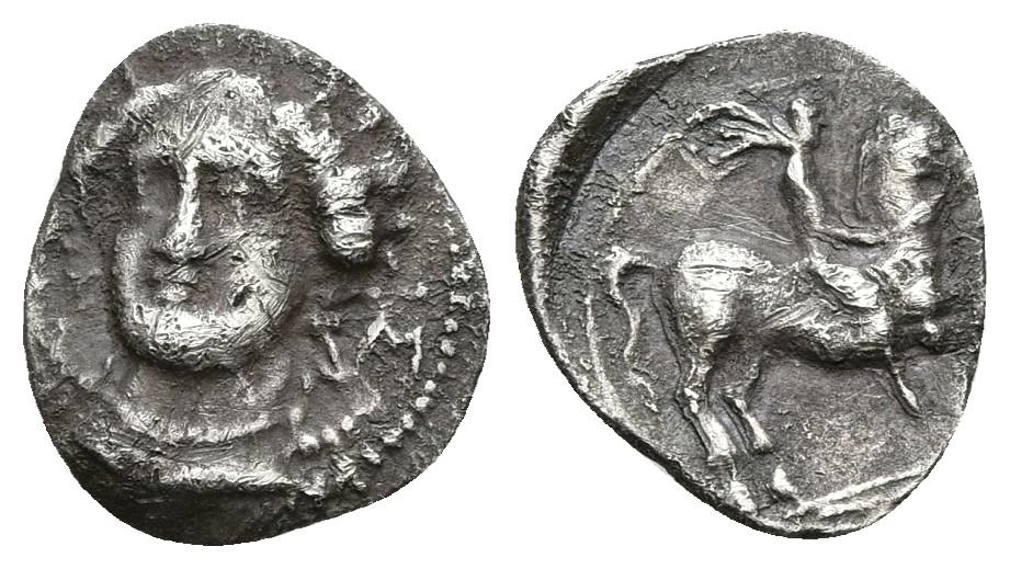 EMPORITON. Obolo. Sant Martí de Empúrias (Gerona). 450-400 a.C. A/ ¿Cabeza de Ceres? de frente, a derecha leyenda E.M. a ambos lados R/ Jinete a derecha, con clámide. FAB-1084. Ar. 0,59g. MBC+. Muy rara.