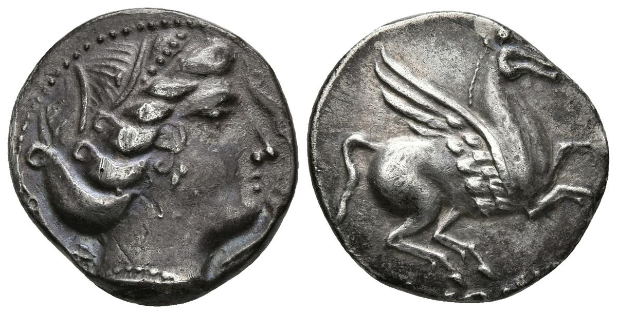 EMPORITON. Dracma. Sant Martí de Empúrias (Gerona). 220-150 a.C. A/ Cabeza de Perséfone-Aretusa a derecha, rodeada de tres delfines. R/ Pegaso a derecha, debajo leyenda griega (EMPORITON). FAB-1101. Ar. 4,74g. EBC.