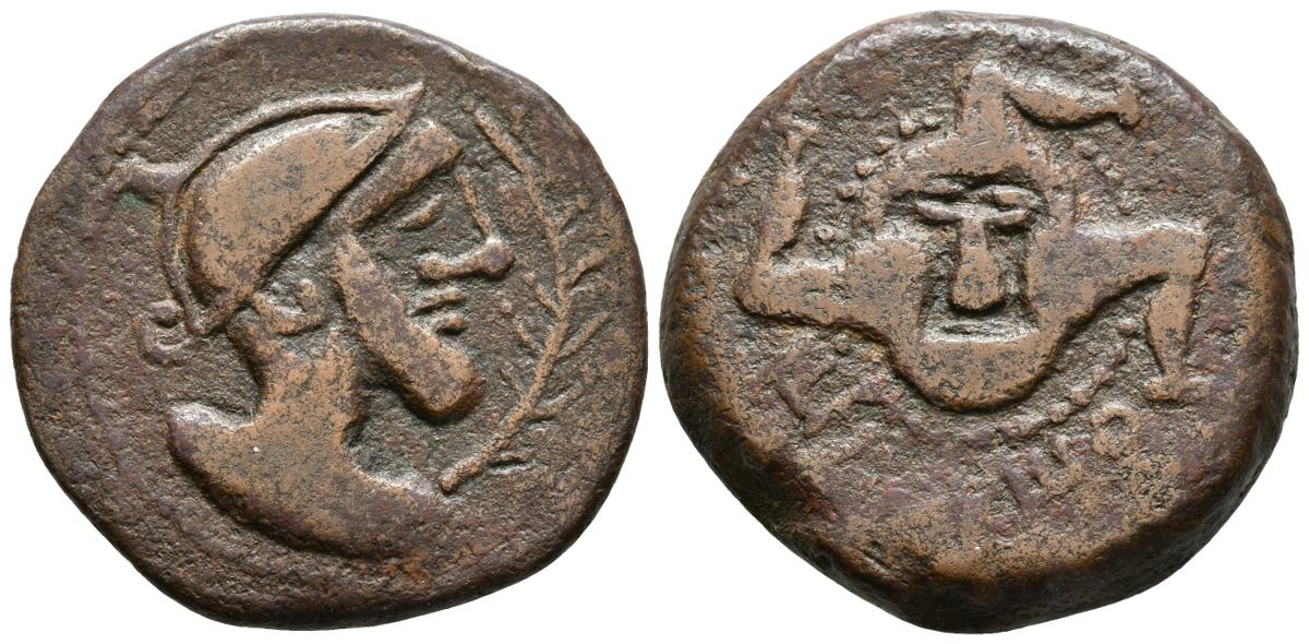 ILIBERRI. As. 150-20 a.C. Granada. A/ Busto con casco a derecha delante palma. R/ Triskeles rodeada de puntos, debajo en ibérico ILTuRIR. FAB-1506. Ae. 16,73g. MBC+. Escasa.