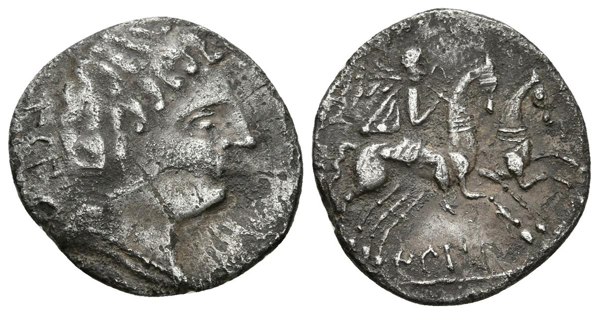 KESE. Denario galo de imitación o Dracma. Tarragona. A/ Cabeza masculina a derecha, detrás inscripción ibérica. R/ Jinete a derecha conduciendo un segundo caballo, debajo inscripción IBINKI. Villaronga 17.2.3; FAB-No cita. Ar. 2,45g. MBC. Muy rara.