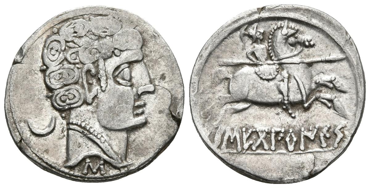 SECOBIRICES. Denario. 120-30 a.C. Saelices (Cuenca). A/ Cabeza masculina a derecha con torque doble, detrás creciente y debajo letra ibérica S. (Punto en la nuca, cuatro líneas entre rizos y siete rizos y medio) R/ Jinete con lanza a derecha, debajo SECoBiRICeS. FAB-2169. Ar. 4,01g. MBC+/EBC.