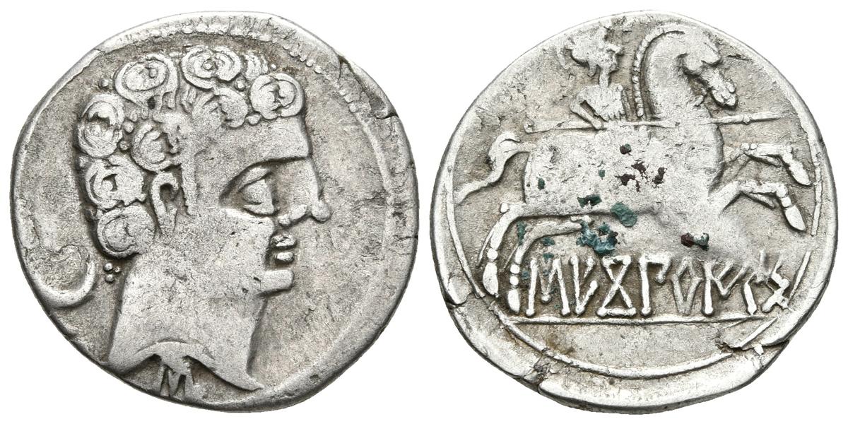 SECOBIRICES. Denario. 120-30 a.C. Saelices (Cuenca). A/ Cabeza masculina a derecha con torque simple, detrás creciente y debajo letra ibérica S. (Tres puntos en la nuca, cinco líneas entre rizos y ocho rizos) R/ Jinete con lanza a derecha, debajo SECoBiRICeS. FAB-2171. Ar. 3,62g. MBC-.