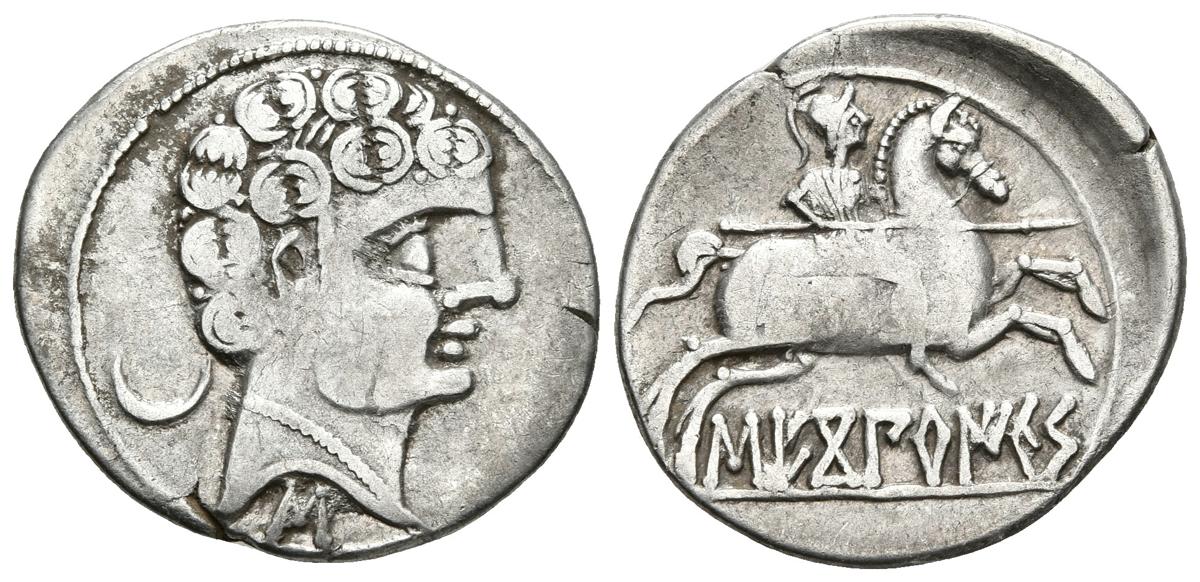 SECOBIRICES. Denario. 120-30 a.C. Saelices (Cuenca). A/ Cabeza masculina a derecha con torque simple, detrás creciente y debajo letra ibérica S. (Tres líneas entre rizos y ocho rizos) R/ Jinete con lanza a derecha, debajo SECoBiRICeS. FAB-2168. Ar. 3,88g. MBC/MBC-.