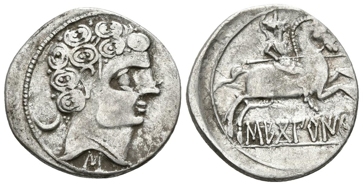 SECOBIRICES. Denario. 120-30 a.C. Saelices (Cuenca). A/ Cabeza masculina a derecha con torque simple, detrás creciente y debajo letra ibérica S. (Tres puntos en la nuca, dos líneas entre rizos y ocho rizos) R/ Jinete con lanza a derecha, debajo SECoBiRICeS. FAB-2171. Ar. 3,54g. MBC+/MBC.