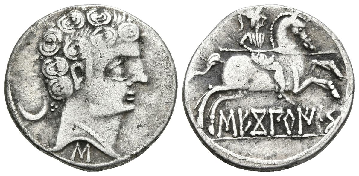 SECOBIRICES. Denario. 120-30 a.C. Saelices (Cuenca). A/ Cabeza masculina a derecha con torque simple, detrás creciente y debajo letra ibérica S. (Tres puntos en la nuca, seis líneas entre rizos y ocho rizos) R/ Jinete con lanza a derecha, debajo SECoBiRICeS. FAB-2171. Ar. 3,49g. MBC+.