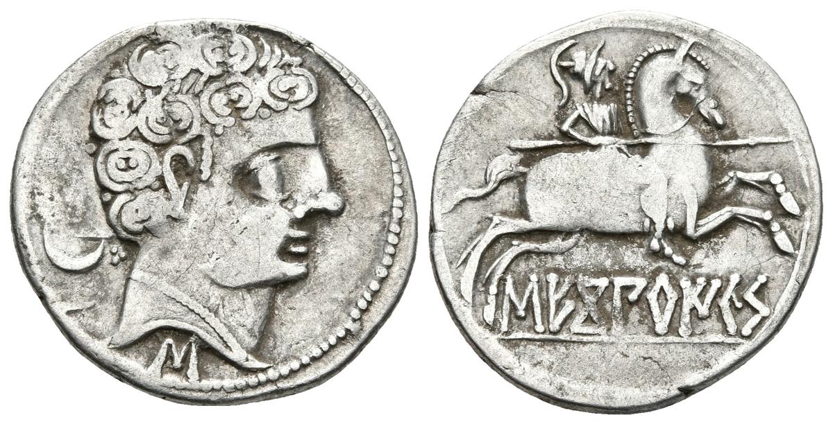 SECOBIRICES. Denario. 120-30 a.C. Saelices (Cuenca). A/ Cabeza masculina a derecha con torque simple, detrás creciente y debajo letra ibérica S. (Tres puntos en la nuca, cuatro líneas entre rizos y ocho rizos) R/ Jinete con lanza a derecha, debajo SECoBiRICeS. FAB-2171. Ar. 3,23g. MBC/MBC-.